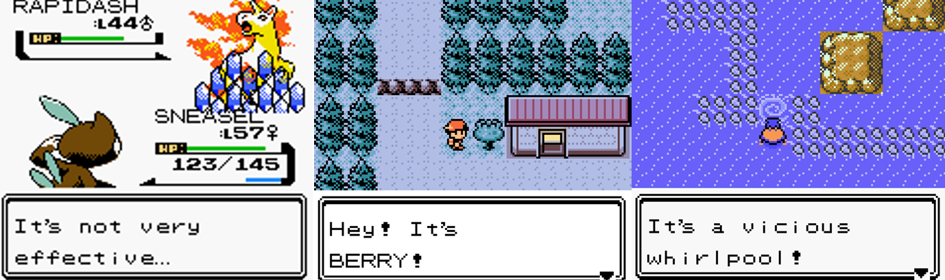 As before, battles and gameplay are as hard as you make them; if you don’t bother levelling-up a diverse team, then battles will eventually become harder to win. You can avoid a Trainer battle by staying out of the sight line of Trainers, but I recommend battling every Trainer you come up against to strengthen your team and earn PokéDollars, and some Trainers will even give you their phone number and call you with tips or for a rematch. Trainers are much more capable this time around; not only do they have all the same options as you when it comes to swapping and healing their Pokémon, but they also don’t have to worry about running out of Power Points (PP). Pokémon can still only know four moves at a time, so you’ll have to either replace an existing move to learn a new one or visit the Move Deleter to do this outside of levelling-up or to forget HM moves, and each move has a certain number of PP. When you’re all out, you can’t use that move anymore and will eventually either have to use “struggle” (which inflicts recoil damage to you), replenish PP with a Berry or Elixir, or restore your Pokémon at a Pokémon Center. If you’re not careful in battle, your Pokémon will end up “fainting” when their HP is drained and, if all your Pokémon faint, you’ll “white out”, lose some money, and respawn at the last Pokémon Center you visited. As before, you also need to be wary of status effects, which can cause Pokémon to flinch (basically miss a turn), become confused (often resulting in them hurting themselves), miss their attacks, fall sleep or become paralysed or poisoned (which also drains HP when on the overworld), burned, or frozen. While some attacks and items will also boost your stats and your chance at inflicting greater damage with a “Critical Hit”, Pokémon: Crystal features far more moves that power up and negate certain Types, like Sunny Day and Rain Dance buffing Fire- and Water-Types, respectively. You can undo these status effects using certain items, and can have your Pokémon hold Berries that they’ll automatically eat when inflicted with a status effect or at low HP or PP to help them shake off these debilitating effects.