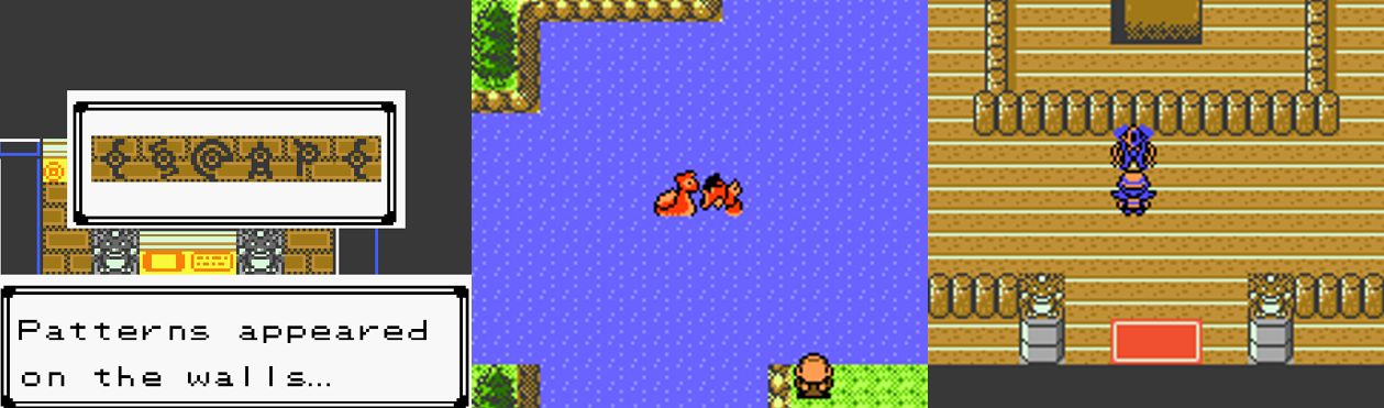 A Pokémon’s gender is clearly visible next to their name in battle, and a further quality of life feature is that you’ll see a little PokéBall next to a wild Pokémon’s name to indicate that you’ve caught it, and the game is littered with similar helpful additions mainly tied to your PokéGear. This device houses your map, phone, and a radio which lets you listen to shows offering tips or music that will either wake up Pokémon or put them to sleep and allow you to track the mysterious goings-on at the Runs of Alph. Here, you’ll investigate strange symbols and encounter the useless Unown, though there are slide puzzles to play here and twenty-four different variations of this Pokémon to find and record for a nearby scientist. Your progress is again restricted by trees, water, and dark caves, but now you also have to content with waterfalls and whirlpools. You can again get past these obstacles with HMs, which again double as faster ways of traversing the map: Fly, for example, lets you fly to any Pokémon Center on the map, but you can also use Dig to quickly exit caves (especially useful when you’re out of Escape Ropes), Teleport to warp to exits, and acquire a bicycle (but, sadly, not a skateboard) to dramatically increase up your movement speed. Many of the same minor puzzles return from the last game, meaning you’ll be pressing switches or pushing boulders or using teleport pads to get around, though you’ll also encounter slippery ice, a strange plant that can only be moved using a special water bottle, and numerous instances where the local Gym Leader is either busy with another task or won’t battle you until you’ve complete a side quest. These primarily involve the returning Team Rocket, who have been cutting the tails off Slowpoke, take over the radio tower, and steal vital components from the Kanto power plant. When team Rocket is in town, you’ll need to clear them all out to make the Gym and other areas accessible, but you’re also hounded by your rival, a red-haired boy who stole a Pokémon from Professor Elm and is obsessed with power. Other side quests include searching for a Farfetch’d in Ilex Forest, competing in a bug-catching contest, fetching medicine for a sick Ampharos, feeding Berries to a poorly Miltank, exploring Dragon’s Den, and capturing a strange Gyarados at the Lake of Rage. This will most likely by your introduction to “Shiny” Pokémon, extremely rare palette swaps of Pokémon that occasionally appear in battle. Perhaps the most prominent side quest here involves the Legendary Beasts, specifically Suicune; the three beasts are released into the wild early into the game but, while you’ll randomly encounter Entei and Raikou while wandering around and be left tearing your hair out as they constantly flee from battle, you’ll come across Eusine in his search for Suicune as you journey around Johto and eventually be able to tackle the elusive beats one-on-one to add it to your collection.