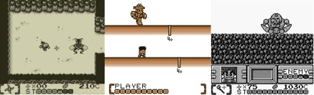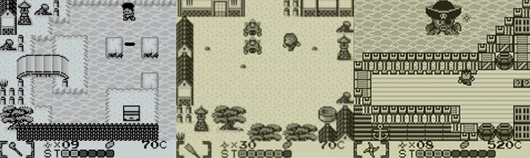 You’ll wander through the town, taking out enemies (who don’t drop anything useful and respawn when you return, making backtracking a chore), and finding stairs down to underground passages, ant hills, castles, and through the Black Ship Gang’s ship. Exploration generally amounts to finding chests that contain a life or weapon power-up, extra shurikens, and coins to spend, but you’ll occasionally find shops and inns in here too and you’ll pretty much always be tasked with finding an NPC with a story-specific item (bamboo, a bomb, the symbol of the Black Ship Gang) that you need to progress further. Graphically, the game really isn’t anything to shout about; considering we were seven years into the Game Boy’s life span by this point and we’d seen an incredibly detailed and layered adventure game in the form of The Legend of Zelda: Link’s Awakening (Nintendo EAD, 1993) about four years prior, it’s hard to not judge Mystical Ninja, which more resembles Super Mario Land(Nintendo R&D1, 1989) than Link’s Awakening. The sound is pretty good, but the sprites are small, lacking in detail, and the environments all become very samey very quickly. Add in the fact that some locations are veritable mazes and include hazards like pits, water, and lava that take a whole chunk off your health and send you back to the beginning and you have a game that just looks dated and lacks all of the visual charm I associate with the Mystical Ninja franchise. By taking advantage of the 3DS’s save state system, you don’t really need to explore all that much as you can just reload if you make a mistake, but that won’t help you when you come across the various mini games that accompany the game’s bosses!