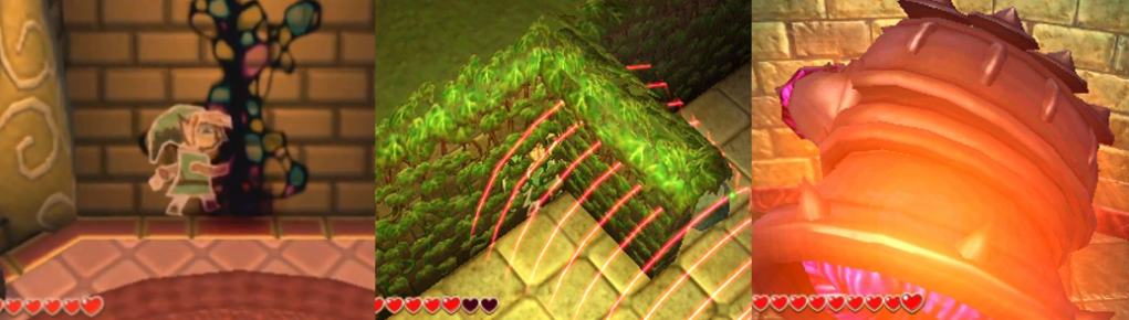 A Link Between Worlds’ other big mechanic is Link’s ability to merge with walls and become a 2D painting for as long as his energy gauge lasts. This is often used in clever ways to add new dimensions to the dungeons, allowing you to race around the perimeter of a room or tower to reach new areas, switches, chests, and levels to progress. When in his 2D form, Link cannot attack or do anything except run, but that’s okay as you won’t have to worry about enemies until the finale. While Link cannot bypass cracks or blockades in this form, he can attach to other surfaces; so you’ll often merge with a moving block and then merge into another to reach a higher or further platform and it can be pretty interesting to play around with the mechanic. As the game progresses, this system is essential as it’s the only way to travel to and from Hyrule and Lorule; ominous dark slits appear all over the map and allow you to travel to each world and, since Lorule is in a fragmented state, you’ll need to go to certain areas of Hyrule, travel between a rift, and then work your way to your destination in Lorule. Despite this, however, I don’t think the mechanic lives up to its full potential; it’s essentially just a quirky means of solving puzzles and navigating dungeons and to travel between worlds and I do feel like the developers missed an opportunity to expand upon it with 2D sidescrolling sections or mini games. There are hidden challenge rooms you can find that often make innovative use of the mechanic, but it’s rare that you’ll need it in a boss battle and a lot of the uses it has could’ve easily been supplanted by your items.