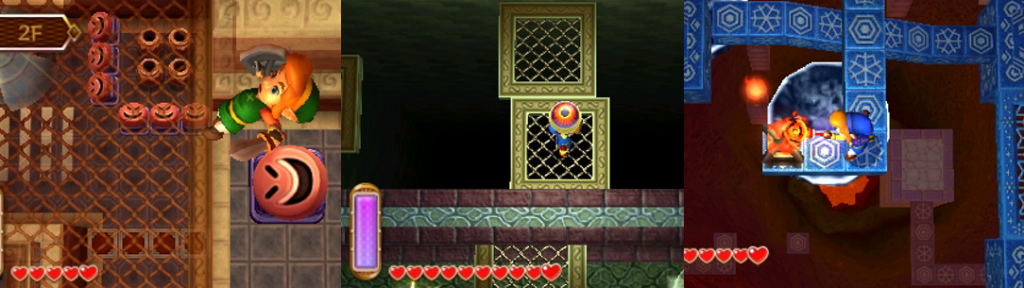 For the most part, puzzles and dungeons will be immediately familiar to any Zelda player, especially anyone who’s played A Link to the Past. You’ll be lighting torches with your lamp and fire rod, or extinguishing them, to open doors or spawn chests, acquiring small keys to unlock doors, climbing ladders and stairs, riding a variety of moving, spinning, and temporary platforms, and activating a number of switches and pressure pads. Sometimes this means dragging a statue onto them, other times you need to trick a Wallmaster into hitting them, and occasionally you need to do both while standing on a third. Blue and red switches will raise and lower their respective walls, partially invisible platforms and mazes dog your progress, requiring more innovative use of flames, and you’ll be hammering down pegs or springs to reach new areas, crossing narrow platforms, and pulling or hookshotting levers to open doors. A couple of times, you’ll need to find eyeball-like orbs to toss into statues to progress, or create temporary platforms using the ice rod, or melt away blocks of ice while skidding on slippery floors. You’ll be diving into water, crossing lava pits on pop-up columns that you must also guide boulders over, riding wind currents, dropping caged bridges to create safe passage, and making use of warp tiles to fast travel about. Many dungeons require more vertical navigation to utilise the 3D function, meaning you need to find new ways to travel upwards, push statues or fall down to lower levels to reach items and doors. You’ll also need to watch for flaming hazards and spiked logs, use your bombs to bring in some light to solve puzzles, use your hookshot to pull rafts across water and lava, navigate foggy mazes, rescue a thief girl and bring her safely to the dungeon’s exit, and even travel outside of some dungeons to reach new areas. Thankfully, you can make use of each dungeon’s compass to help you find your way and you automatically have a map available when you enter, though the only way to save is to exit to the outside, which respawns any enemies you’ve defeated.