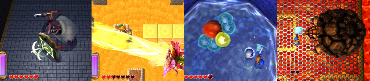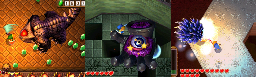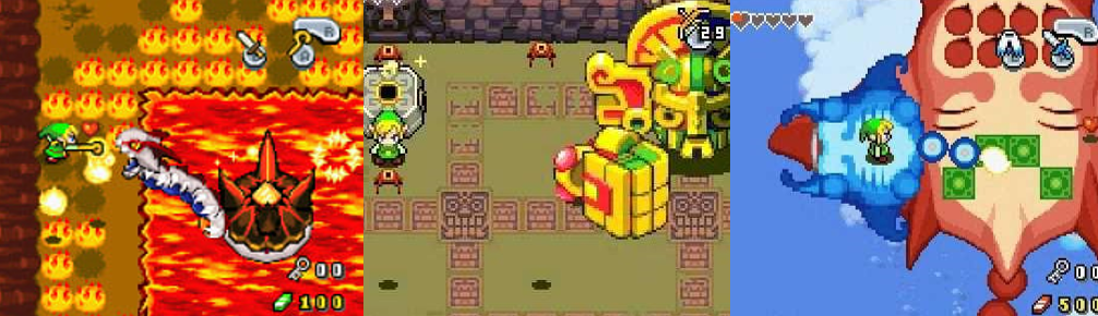 The Minish Cap is surprisingly light on bosses; four of its five main bosses guard an Element, which empowers your sword and duplicates Link, relinquishing a Heart Piece to extend your life bar. The first boss you battle is a gigantic green ChuChu; well, it’s actually a regularly sized one but you’re in Minish form, so it appears huge. A blue variant appears later in the game too, now sporting electrified skin, but the tactic of sucking at its “feet” with the Gust Jar and whacking it with your sword when it’s stunned remains the same. Next, you face the turtle-like lava dinosaur Gleek, which sits in a pool of lava and spits fireballs in a circular motion. You must run behind it and flip its shell with the Cane of Pacci to race up its neck and attack the crystal on its back. In retaliation, it rains rocks and breathes fire, making the fight more difficult as it progresses. Mazaal is the only one of the main bosses to incorporate the shrinking mechanic in. A strange, disembodied Aztec head and fists, he is stunned by shooting and slashing the jewels on his hands (which try to crush and hit you). You then shrink, enter his head, and attack the glowing pillar to deal damage. As the fight progresses, you use the Mole Mitts in his head and dodge a Shrink Ray attack from his eyes. The Big Octorok is fought in a shallow pool that it freezes, reducing your traction and making avoiding its pellets much harder. Well, I say “avoid” but you actually smack these back with your sword to stun it, allowing you to set fire to the petal on its back. This causes rocks to rain down and the Big Octorok to freak out; it also charges, spins around, and creates a smokescreen to limit visibility. Finally, the Gyorg Pair are easily the most unique boss in the game. This fight takes place in the skies of Hyrule on the back of two manta ray-like creatures. When riding the red one, you must dodge the smaller blue one and its fireballs and duplicate Link to attack the red one’s eyeballs. You then hop to the blue one, slashing its eyeballs, and repeat, watching for smaller green variants that fly past.