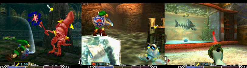 Termina is full of NPCs, all of whom have different thoughts on the current situation and different issues to deal with. Over the course of the three days, you’ll interact with them several times, with key events being recorded in your handy-dandy Bomber’s Notebook so you can keep track of what’s going on and when. This functionality is great for new players and for people like me, who like to efficiently complete the game’s side quests as quickly as possible. Because of the time travel and three-day loop, you’ll repeat certain events and trigger certain cutscenes multiple times, requiring you to rescue old ladies and injured witches, follow shady characters, and retrieve certain items to complete side quests. Many side quests are ongoing, requiring multiple steps (such as reuniting Anju and Kafei, which will take you right up to the last minute of game time and sees Link and Kafei working together to solve switch-based puzzles in Sakon’s hideout) or occur at specific times (such as the surreal defence of Romani Ranch against alien invaders!) Other quests are more low-key, such as using the Bremen Mask to engross little chicks, defending Cremia’s milk delivery from the Gorman Brothers, besting the various shooting galleries and fishing holes, and delivering fish to the Marine Research Lab. Other side quests can be quite involved, such as reuniting the frog choir, using all of Link’s transformations to form a band, digging up treasure with Dampé, and challenging the mini bosses to a rematch. You’ll also be using all your weapons and skills in Gold Skulltula Houses, taking pictures with your Pictograph Box, visiting Gossip Stones, and answering the Keaton’s quizzes. Your reward for these endeavours is either a new mask, a Piece of Heart to extend your maximum health, a bottle, or some Rupees, all key items to assist your adventure.