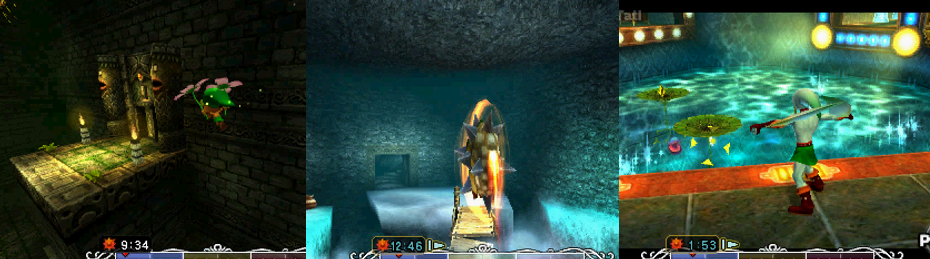 Additional Features: There are fifty-two Heart Pieces to find all around Termina; some are hidden in secret holes, some are up trees or require your weapons to access, some are gifted to you as rewards, and some require you to complete side quests. You’ll be dancing with the Rosa Sisters, giving a weird, disembodied hand some toilet paper, stopping a timer at exactly ten seconds, checking mailboxes, and besting the shooting galleries to acquire these helpful upgrades. Your main objective throughout the game is to acquire all the different masks, which requires interacting with all the NPCs and keeping an eye on their routines with the Bomber’s Notebook. While some masks are more useful than others, each has a specific function and will allow you to get other masks, Heart Pieces, or rewards depending on who you interact with when wearing them. Similarly, it’s worth seeking out the upgrades to Link’s sword, wallet, and items, if only to further explore the world, and making sure you bank your Rupees before resetting the three-day cycle. You’ll also find many Gossip Stones placed all over that will give you hints if you interact with them while wearing the Mask of Truth, and the Sheikah Stones return from Ocarina of Time 3D to provide you with more detailed directions if you get stuck. The manual save system has been revamped, with additional Owl Statues appearing in the game (though you can’t warp to all of them), and some of the rewards and side quests have been changed. Most notably, Link can now acquire seven empty bottles (which is, admittedly, a little excessive), with the last gifted after completing a new side quest involving the Gorman Troupe. Another new feature is the inclusion of two fishing holes, which you can either pay to use or acquire a pass to fish for various fish, though there are no rewards tied to this beyond trying to snag the legendary Lord Chapu-Chapu. Since the game resets when you go back in time, there’s no Boss Rush Mode this time around and, sadly, the developers didn’t see fit to include a mirrored Master Quest mode, though you now have three save slots instead of just two.