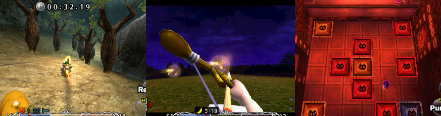 You assign different weapons and items to the X and Y buttons, while other items are assigned to the I and II slot on the touchscreen for easy use. By default, your trusty ocarina and, later, the Pictograph Box are selectable from the top and bottom left of the touchscreen, which is also where you’ll find your map, health (represented as hearts), magic meter, and item and mask menu. Though a child, Link eventually acquires many weapons he utilised as an adult. These are found within the game’s Temples and are often necessary to defeat the mini boss and main boss within, as well as being used to solve various puzzles. You can acquire the Hero’s Bow and a variety of elemental arrows, allowing you to attack enemies from afar, hit switches, burn objects, and create ice platforms where indicated. Bombs and Bombchus are used to blow upon walls and discover secrets, Deku Sticks allow you to light torches, Deku Nuts briefly stun certain enemies, and you can snag on to certain targets and parts of the environment with the Hookshot to cross gaps or bring items to you. Magic Beans can be planted to create platforms to new areas, the Lens of Truth will reveal hidden paths and secrets while draining your magic, and you can capture life-restoring Fairies or store various potions in one of Link’s many bottles. Players can also strengthen their sword by following a specific side quest; though the Razor Sword is only temporary and will eventually dull, it can be further (and permanently) upgraded to the Gilded Sword. Similarly, you can earn yourself the massive Great Fairy’s Sword and obtain the light-reflecting Mirror Shield, and eventually purchase large Powder Kegs to destroy larger boulders. Link can also expand his inventory with bigger quivers, bomb bags, and wallets. Though you lose all your Rupees and ammo stock whenever you travels back in time, you can bank your Rupees in Clock Town and will find plenty of ammo by cutting up grass and defeating enemies.