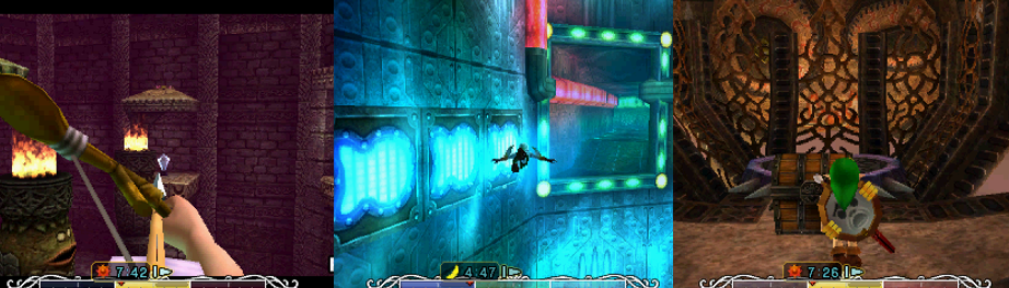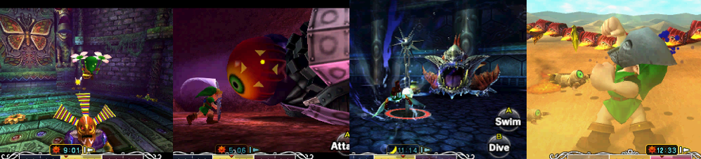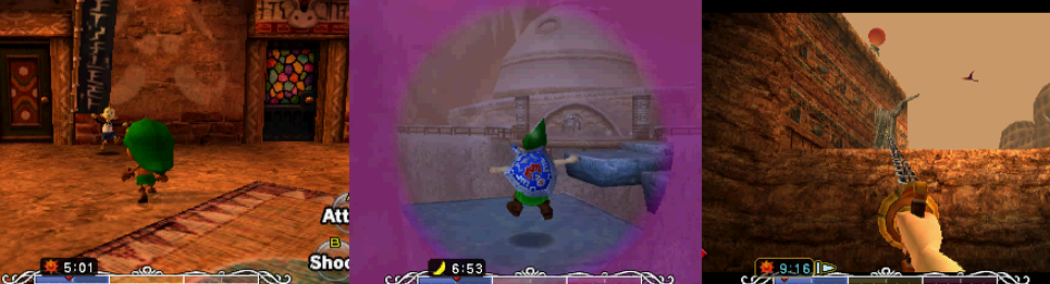 Majora’s Mask is easily one of the most bizarre and bleak Zelda adventures. Right from the beginning, the story starts with a melancholy tone, with Link wandering the lands in search of Navi, only to have his horse and ocarina stolen by the Skull Kid and his mischievous fairy companions, lost in a strange land, and transformed into a Deku Scrub! Like in Ocarina of Time, Link is partnered with a fairy, but Tatl is no Navi; she’s rude, obnoxious, and rarely gives much help when searching for an enemy’s weak spot. Over the course of the game, the two find common ground as Tatl’s concern for her friend and her brother, Tael, grow, and Link’s courage is called upon again to aid the aggressive and slightly demonic Happy Mask Salesman in retrieving Majora’s Mask. Most interactions take place using the in-game engine and simple text boxes, but horrific (thankfully skippable) cutscenes play every time you put on a transformation mask, suitably dramatic cutscenes play when Temples rise up or NPCs are laid to rest to increase Link’s abilities, and you’ll get helpful reminders when day turns to night turns to day and the countdown to destruction looms closer. Speaking of which, the grim-faced Moon looms ominously overhead, growing closer and closer and causing small earthquakes. NPCs become more fearful or flee as the game progresses, and woe befall anyone who lets the timer runs out and must watch the Moon obliterate the land! While many of the assets, models, and elements are recycled from Ocarina of Time, they’re all much improved, with characters constantly on the move and doing their own thing, which you can track with the Bomber’s Notebook. Many musical cues and tracks return as well, though the Termina Field Overture is far more bombastic and engaging for me, and each area boasts a fittingly twisted soundtrack that’s both familiar and unique. The 3DS version changes up the presentation a bit, redesigning the countdown timer, area intros, and tidying up the graphics and assets to really make the colours pop, add helpful guidelines to certain areas, and even mixes up the puzzles and locations of certain items.