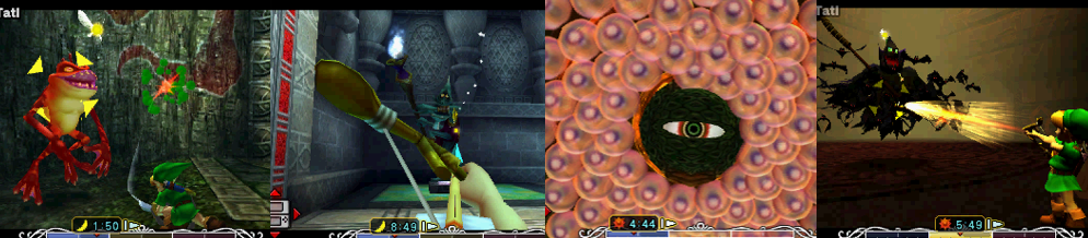 Each Temple houses at least one mini boss who must be overcome, sometimes multiple times, usually to obtain the Boss Key or the dungeon’s weapon. Many of these will be familiar not just to players of Ocarina of Time, but also long-time Zelda fans: Dinolfos and Iron Knuckles appear more than once and fit into this category, for example, but Majora’s Mask sees the return of series staples such as Wart and Wizzrobe. Wizzrobe is fought multiple times in multiple Temples, teleporting about, creating illusionary doubles, and attacking with fire or ice magic. Wart appears in the Great Bay Temple and is, as usual, a giant eye surrounded by bubbles that Link must destroy to get a clear shot at its pupil, while being mindful of it firing them as projectiles and bouncing around in a frenzy. The Gekko appears twice in the game, first riding a Snapper and attacked via a Deku Flower and then encased within a giant, gelatinous substance that must be frozen with Ice Arrows and shattered to attack the slippery devil. In the Ikana Graveyard, Link chases the gigantic Captain Keeta, fending off his lackeys and hacking the giant’s legs to get his attention. You must avoid his swipes and flaming barriers and pelt him with arrows to stun him, but the main issue here is keeping up with him so he doesn’t flee (but that’s what Hylia created the Bunny Hood for!) Stone Tower Temple is home to two more tough mini bosses: first up is the Garoa Master, a teleporting assassin who drops from the ceiling and attacks with a charge. Stay away from his attacks to strike back when his guard is lowered, and be sure to keep your distance when he’s beaten as he’ll blow himself up with a bomb! Defeating him earns you the Light Arrows, which are key to dispelling the bats protecting Gomess. Gomess attacks with a scythe that can cut through your shield, so be sure to jump-slash his exposed heart when you see an opening.