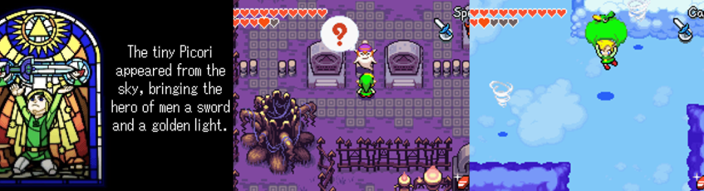 Link’s newest gimmick in The Minish Cap is the ability to shrink to microscopic size, courtesy of Ezlo’s magic. This is performed primarily at magical tree stumps and allows you to enter small holes, climb small steps and vines, and access out of the way places. When shrunk, you’ll interact with the pixie-like Picori tribe (or “Minish”) scattered throughout Hyrule (once you’ve consumed a Jammer Nut, that is) and be given additional side quests and assistance from them. In this form, Link takes more damage and his weapon usage is limited, but he can talk to animals and cross small lily pads. Occasionally, Minish Link enters Armos statues to activate or deactivate them and the action frequently zooms in to follow him up rafters, into the Minish towns, and through enlarged (from your perspective) areas, like in Honey, I Shrunk the Kids (Johnston, 1989). Apart from this, Ezlo is more a hinderance than anything; he’s obnoxious and rude and demanding and pops up to point out the obvious, severely dumbing down puzzles and interrupting the gameplay. The other big mechanic here is Kinstones; as you slash bushes, defeat enemies, and open chests, you’ll find several coloured Kinstone pieces. These are fused with certain NPCs to alter the overworld in different ways. This may involve spawning a treasure chest containing another Kinstone, or Magical Seashells, or a Big Rupee, or even a much tougher gold enemy for an additional challenge. Fusing removes vines to open new areas, parts waterfalls, drains ponds, and even spawns in NPCs for you to trade and train with. You can buy Kinstones, but they cost a lot and it’s not really worth it as you’ll inevitably find them on your travels, and none of the main variants are necessary to complete the story, though the benefits (extra hearts, Rupees, and training with the uncovered Grimblades) can be worthwhile. Specifically, fusing with Din, Farore, and Nayru spawns Lucky Butterflies which, when touched, increase your digging, shooting, and swimming speed. The only time you’re required to fuse Kinstones is when you find golden ones, such as in Cloud Tops, where you navigate a maze of clouds, floating about to find different halves of golden Kinstones to activate five propellers and be blasted up to the Palace of Winds.