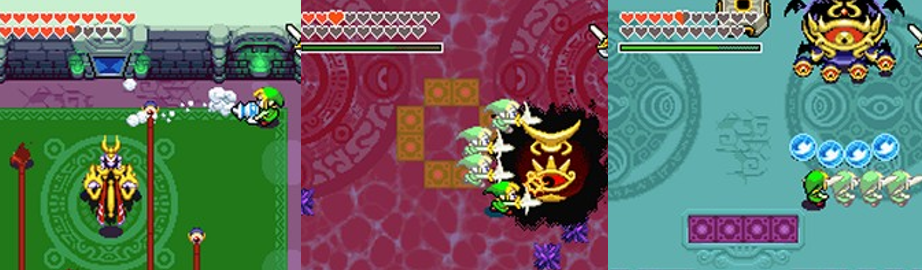 Enemies and Bosses: All of Zelda’s most recognisable enemies make a return in The Minish Cap, though redesigned to evoke the toon style of The Wind Waker. This is most evident in the Moblins, who charge with spears or fire arrows and have much more life and detail compared to past 2D Zelda titles In some cases. This ups the challenge represented by some enemies, such as the various Dark Knights you’ll encounter. These are essentially mini bosses and swarm Dark Hyrule Castle, defending against your attacks and landing powerful sword swipes and even boasting a charged thrust. Your best bet against these enemies is to hop over them with the Pegasus Boots and attack from behind, a tactic mirrored when facing the Ball and Chain Soldiers. Other enemies require strategic use of your other items, such as using the Gust Jar to suck up and fire out the annoying Peahats or pull the masks off Helmasaurs, tossing your boomerang at Sparks, or using the Cane of Pacci to flip Spiked Beetles and attack their vulnerable underbelly. Like Likes masquerade as Rupees and steal your items, Keatons and Takkuris make you drop Rupees on contact, Madderpillars (also a kind of mini boss) fly into a rage with you bop their noses and attack their tails, and you’ll even encounter Bob-ombs and Lakitus. ChuChus fry you, Floor and Wall Masters return you to the Dungeon entrance, and Octorocks and Deku Scrubs are subdued by deflecting their projectiles. Cloud Piranhas snap at you from the clouds, fake doors crush you, and Acro-Bandits leap from the ground in a swaying tower. You’ll also battle elemental Wizzrobes, who teleport about shooting ice, fire, or lightning; Stalfos leap and toss their bones at you; and Slugglas drop from above. By the time you reach Dark Hyrule Castle, rooms are filled with an assortment of these enemies. Though you can often simply bypass them, you’ll need to defeat a gauntlet of them before Vaati completes his macabre ritual to reach the petrified Princess Zelda in the finale.
