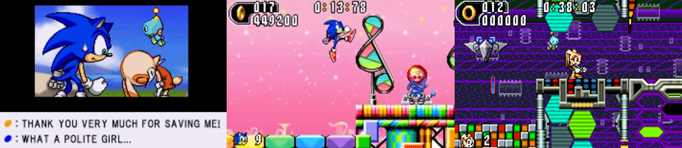 Sonic Rush Adventure is one of the more visually unique Sonic games, especially in its environments. While Zones blast along a mile-a-minute and it’s easy to overshoot ramps or plummet down the many bottomless pits, the new, sea- and pirate-themed aesthetic really benefits the visuals. This is immediately apparent in the heads-up display, whose font is a far cry from the usual, generic lettering in other Sonic titles and more akin to the short-lived “Storybook” games on the Nintendo Wii. Things start pretty standard in Plant Kingdom (which features vines to swing from and grind on, bouncy mushrooms, and robotic dinosaurs) before delving into steampunk in Machine Labyrinth. Similar to Metropolis Zone, Machine Labyrinth features steam-based springs and winding tubes alongside the hang glider, pinwheels, and massive drums that pinball you about. Coral Cave is a coral spin on a mine, featuring crystalline coral, coral bridges, and a partially flooded grotto alongside abandoned mine carts and tracks and waterfalls. Similar to Pirates’ Island, you must pay attention to the top screen or you’ll get crushed by falling hazards that are used as platforms to higher areas, and giant anchors will swing you about, too. The Haunted Ship was probably my favourite Zone. Featuring a misty graveyard of wrecked ships in the background and seeing you dash up ropes and mainsails, you’ll explore the dishevelled interiors, bash robotic pirate ghosts, and blast between ships using massive cannons. You’ll also bounce up to higher areas using special ropes or be forcibly dragged up by barrels. Sky Babylon was also visually very interesting, sporting a green night-time sky and strange, neon-glowing ruins in a mish-mash of Marble Garden, Sky Sanctuary, Altitude Limit, and the Babylon Garden. Strange floating orbs drag you higher, destructible platforms drop you past flaming hazards and to the ever-present electrical bolt lurking below, and you explore both the background and foreground. Blizzard Peaks started strong with its snowboarding section, which allowed some fun grinding, and with its snowy slides and giant icicles that you must jump between. Pirates’ Island is, essentially, Sonic’s version of Venice, featuring stone buildings, flooded ruins, spring-loaded fountains, and helpful dolphins to navigate its waters. These environments and their gimmicks are all recycled for the Hidden Islands, and there’s even a degree of choice in which locations you visit depending on which ships you have.