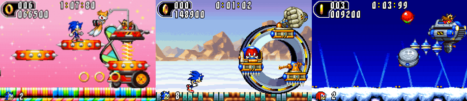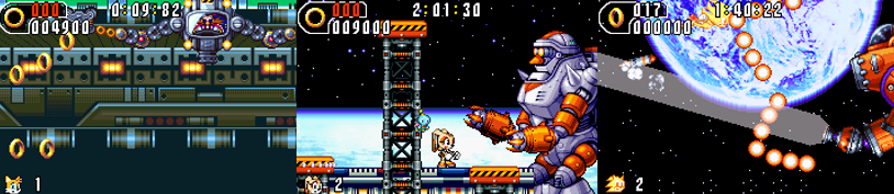 Sonic Rush Adventure bolsters its unique environments with a slew of all-new Badniks, each one the creation of the Dr. Eggman/Eggman Nega duo and in keeping with the nautical/pirate aesthetic of the game. The most persistent of these are the various “Kaizoku” Badniks that toss explosive barrels, glide around on hang gliders, fire small, shoulder-mounted cannons, hide in snowballs, or attack with a cutlass. The Kaizoku Hogan variant is a touch tougher than the usual Badniks, swinging a ball and chain and sporting a health bar. The Hover and Gunner variants fly about using jetpacks, and the Skeleton versions float around like wandering spirits and toss bone sat the player. These Badniks are bolstered by the “Shisaku-gata” series of mechanical miscreants who chuck spanners, hover using steam-powered jetpacks, and push you back with jets of steam. More traditionally designed Badniks also appear, such as the Barrier Angler (a robotic angler fish, which also has an electrical variant), the Jaws-like Nibbles, the Dive Bat (another of Dr. Eggman’s many bat-themed Badniks), and the Rabid Crab (which focus more on melee attacks than Crabmeat’s projectiles). The Triceratank charges you with its horn similar to the Rhinobot, Ptera swoop from the skies, Sky Moons fire projectiles while hovering in the path of your jumps, and steam-powered Bomb Ghosts wander the Haunted Ship ready to explode in your face! Each Zone ends in a boss battle against one of Dr. Eggman and Eggman Nega’s gigantic robot creations. Unlike in the last game, where you were restricted to either a platform or a ring, Sonic Rush Adventure features more variety to its boss battles. You’re still restricted to a set area, but the arena and boss strategies alter as the fight progresses, switching between the screens. Each also possesses a health bar, though you no longer have your allies cheering you on, and ends with a dramatic, slow-motion final blow against the mech.