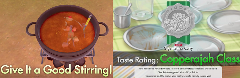 There is a startling amount of online connectivity in Pokémon Shield; when connected to the internet and in the Wild Area, other players will spontaneously appear to join you in Max Raid Battles and offer helpful items. You can also battle and trade with others players online, as usual, but you’ll need to pay for the Switch’s online service to do any and all of these things, which is a real greedy move on Nintendo’s part as you never had to do that in the previous games! You can also set up a tent at any time, and may encounter other player’s Pokémon Camps; here, you can “speak to” and play with the Pokémon in your team to improve your bond with them. Doing this, and being a good, consistent trainer, means your Pokémon try harder in battle and will land more critical hits, keep themselves from fainting, or even shake off status effects to please you. In the Pokémon Camp, you can also take part in the game’s newest mini game: curry making. By exploring the overworld and shaking trees, you’ll acquire a variety of berries and other ingredients to throw into a cauldron and whip up a variety of curries. While camping gains your team some EXP by default, curry will provide them with a lot more EXP and also restore their HP; certain NPCs will also rate and reward your curry-making skills and you can make curry with other players if they join you in a camp. Furthermore, by accessing the PC, you can send your Pokémon off on jobs to earn them some EXP outside of battling (though I never actually bothered with this).