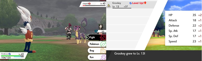 Enemies and Bosses: As you explore Galar, you can choose to battle the various Wild Pokémon that are wandering throughout the overworld; these will hide in grass or underwater, run out into the street, chase you (or run from you), or more powerful variants may pop up in the Wild Area. In each instance, you have much more flexibility about engaging or fleeing from these battles; when you battle, you’ll still earn EXP even if you capture the Pokémon and, in a change that I’m sure irked many, all of your Pokémon will gain some EXP from every battle (but only those that actually participate will gain the most and the EVP from each battle). Like all Pokémon regions, Galar is also populated by other Pokémon Trainers; these days, the game clearly shows you a fellow Trainer’s line of sight so you can try to sneak past or avoid them but I recommend battling every one you come across to level-up your team faster and earn more money. Pokémon Trainers are generally armed with only one or two Pokémon in the early going but eventually have more (and far stronger) Pokémon in their team.