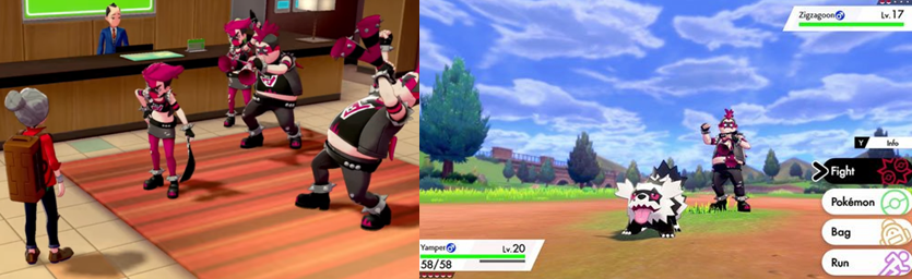 When battling, be sure to keep an eye on the Power Points (PP) of your Pokémon’s moves; each move has a certain amount of PP and, when it’s spent, you can’t use that move anymore and may be reduced to literally struggling to survive. Similarly, as with many Pokémon games, you may have to battle two trainers at once in a double battle either alone (with two of your Pokémon) or with a computer-controlled partner (usually Hop). In these battles, it’s important to consider the effect your attacks may have on your partner and the game encourages players to use moves like Helping Hand or Wide Guard to help protect or buff your partner (of course, because I adopt an aggressive approach to battling, I don’t do this). As in every other Pokémon game, you’ll also run afoul of a team; in this case, it’s the punk-rock-inspired Team Yell. Unlike other teams, though, Team Yell aren’t out to steal or manipulate Pokémon or to destroy the world; instead, they are the cheerleaders and groupies for one of your rivals, Marnie. Led by Marnie’s older brother (and Gym Leader), Piers, Team Yell generally cause a nuisance by blocking your path or forcing you into a single or double battle at various points but are little threat compared to the likes of Team Rocket or Team Magma/Aqua.