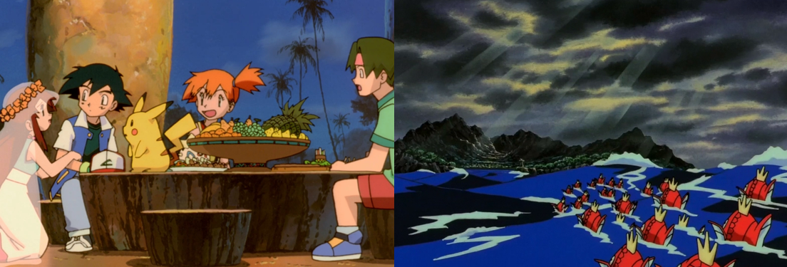 Naturally, Ash, Misty (Lillis), and Tracy Sketchit (Lewis) are currently travelling around the Orange Islands and, thanks to their current guide, Maren (Tara Jane), they soon learn all about the same prophecy and the legend of the treasures from the natives of Shamouti Island. While Melody (Birnbaum) stresses that its just a simple legend that they observe for fun and frivolities, Ash takes to his duties as the “Chosen One” with vigorous enthusiasm and the gang notice that all of the Pokémon in the area, including Pikachu (Ōtani), are acting strangely. Sensing the tumultuous changes in the weather, which causes sudden rain and snowstorms, Pokémon flock to Shamouti Island in droves since they feel that the natural balance of the ecosystem is in turmoil. Melody is largely dismissive of the island’s rituals and customs, believing them to be outdated and boring, much to the chagrin of her older sister, Carol (Michelle Goguen); despite her frivolous and snarky attitude, though, Melody still takes part in the ritual, which calls for her to dance about in a pretty dress and play the “Guardian’s Song” on conch-like ocarina. When the natives peg Ash as being the Chosen One simply because he happens to be a young Pokémon trainer, Melody immediately finds a more interesting reason to play her role as she takes an instant liking to Ash, much to Misty’s annoyance. This adds an interesting wrinkle to the film and the main characters as Melody constantly winds Misty up by flirting with Ash. Clearly jealous of Melody, Misty acts all passive-aggressive at the suggestion that she is Ash’s girlfriend and, unlike in the last film where she (and basically everyone else) just stood around doing nothing, this at least gives her a small arc where she realises that she’d do anything to help out her friend.
