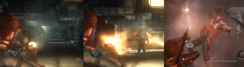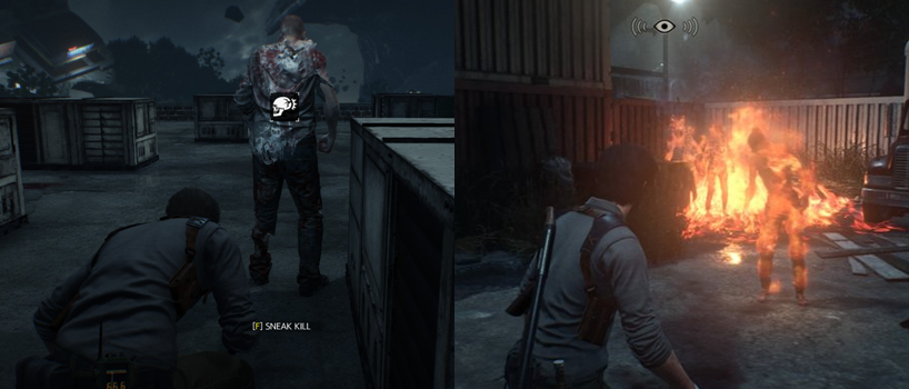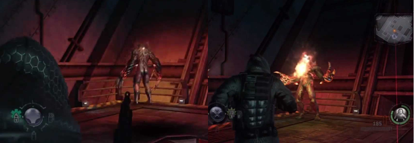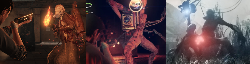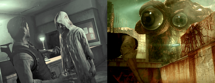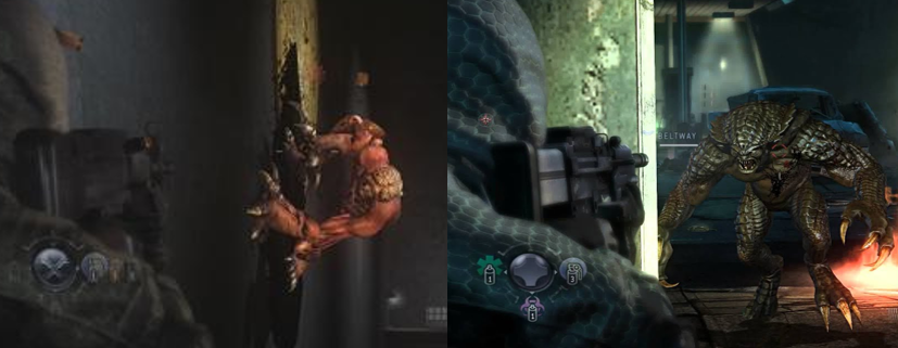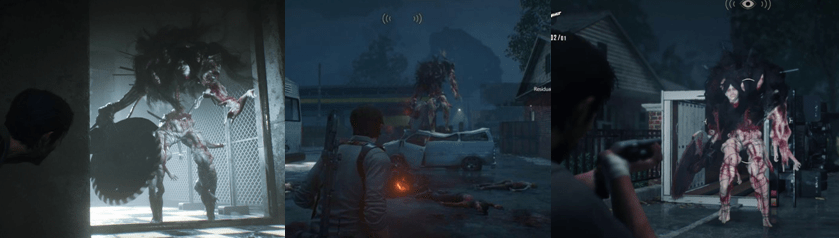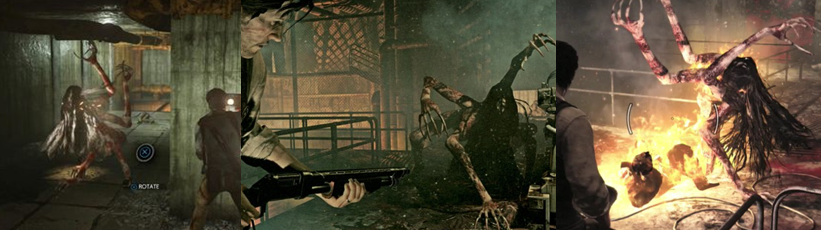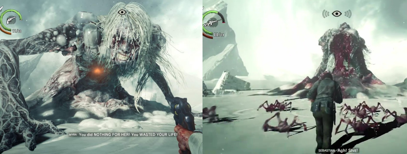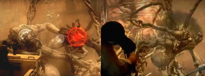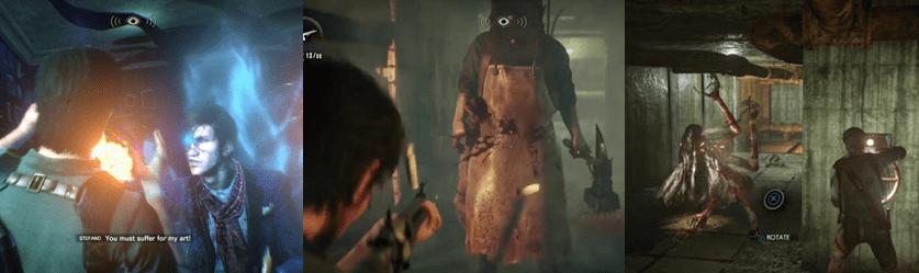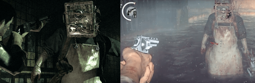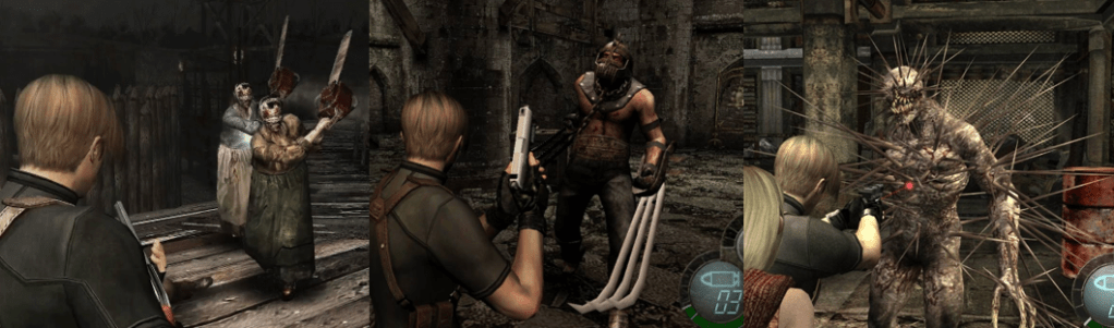 Larger, more monstrous enemies are also commonplace and act as mini bosses. The first you’ll encounter is the Chainsaw Ganada, a burlap-sack wearing madman who will lop your head clean off if you don’t make good use of the parry system. As if their sporadic appearances aren’t bad enough, you’re also forced to fight the Bella Sisters again, this time in an enclosed room (which actually makes it easier to track them), and the aggravating, claw-handed Garradors. Though brutish, heavily armoured, and extremely dangerous, Garradors are also slightly easier here as you’re not locked in a small cage and have more room to manoeuvre behind them to shoot the parasite on their back, stunning them for a more effective attack. Similarly, sledgehammer-carrying Brutes often show up, though their wild swings can just as easily wipe out nearby lesser enemies, as well as lumbering El Gigantes. This time, when you battle the two of them in the furnace, Luis is there to help; though he’s more of a distraction and hinderance as he needs to get clear before you can drop their asses into the molten steel. As ever, two of the more disturbing enemies-cum-mini bosses are the cackling, slug-like Regenerators and spiky Iron Maidens, two intimidating creatures that shrug off bullets and grenades, rapidly heal even when blasted in two, and pounce on you to try and eat your face and skewer you. The only way to effectively destroy them is by finding and equipping the Bioscope Sensor to your rifle so you can see and shoot the parasites lurking in their bodies, which can be easier said than done thanks to their erratic movements and extendable limbs. Another memorable boss encounter is, of course, the massive, mutated salamander Del Lago. You’ll need to use LB and RT to throw your unlimited supply of harpoons and the beast, avoiding the obstacles floating in the lake and chucking your spiked implements into its mouth when it leaps from the water. Thankfully, your encounters with the Verdugo are much more manageable this time; instead of running around a maze of shipping containers and fighting it in a cave, you must simply freeze it with liquid nitrogen and avoid or parry its lashing tail attacks when prompted.