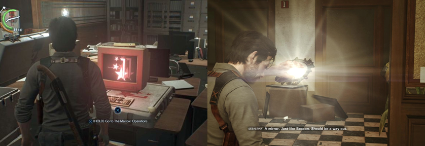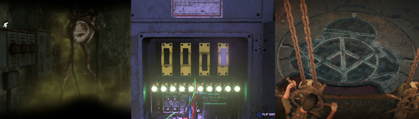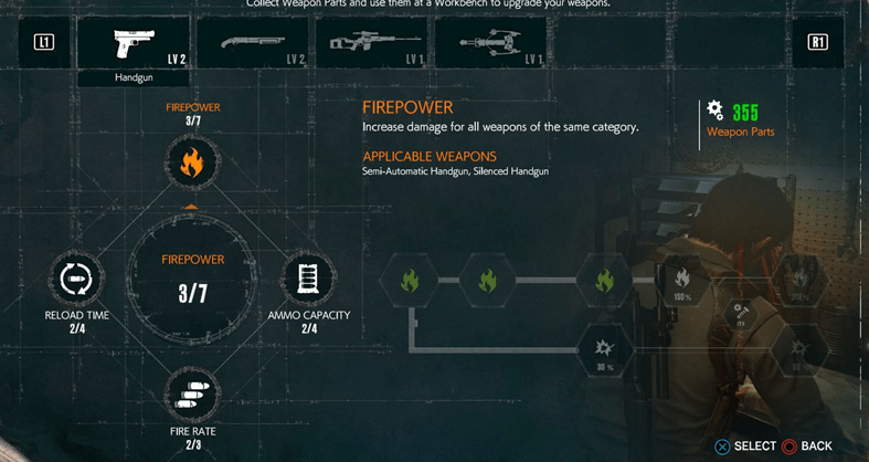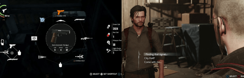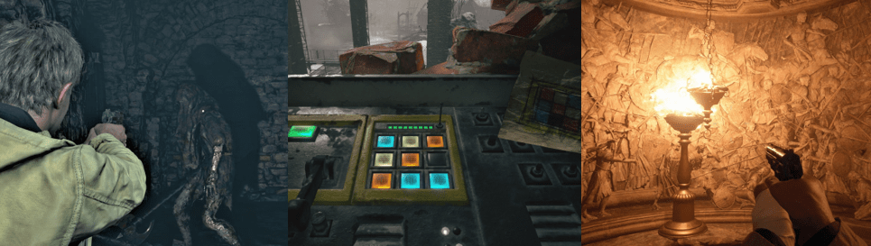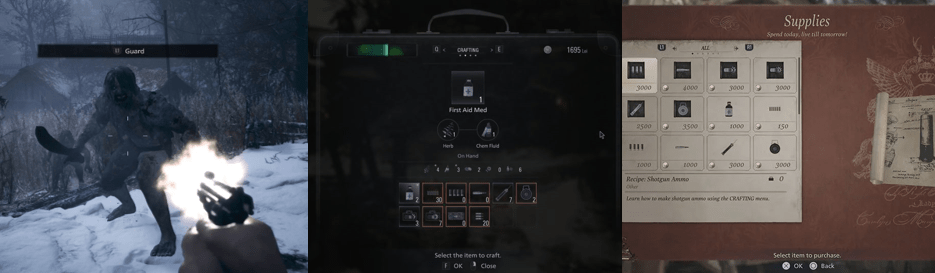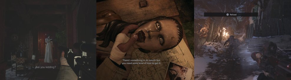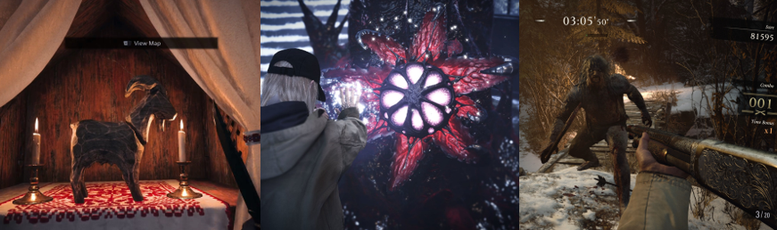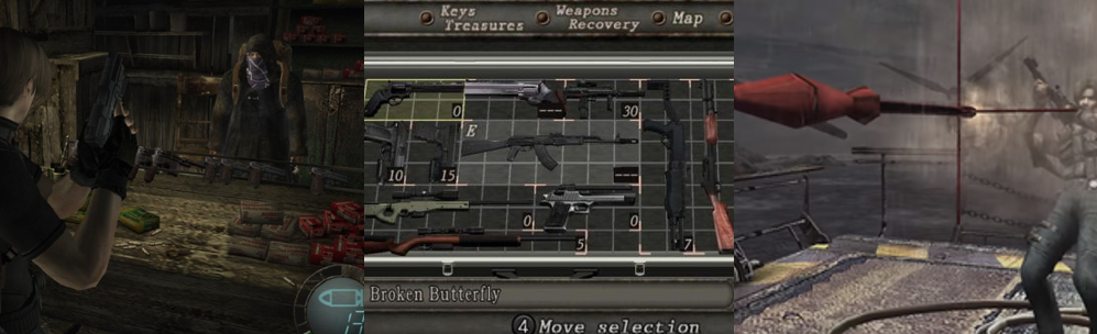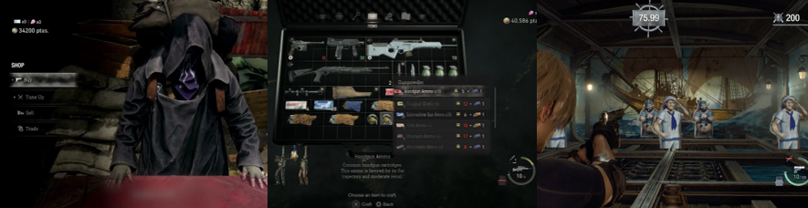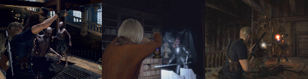 As you explore the game’s environments, you’ll find key items to progress and useful pick-ups to aid you. Small keys, cuboid blocks, medallions, and such access treasures, ammo, or healing items, or resources for crafting. Defeated enemies will invariably drop an assortment of supplies and you can smash open crates to acquire them, too (just watch out for snakes!) First-Aid sprays and herbs will restore your health, as ever, but you can also eat eggs and fish to do the same. You can combine green, red, and yellow herbs to recover more health and extend your health bar, which is always handy. Treasures come in many forms, from various jewels to ornate masks, clocks, and the like. The bigger ones house your smaller jewels to increase their value and you can also sell unwanted ammo, guns, and items to the Merchant for more cash. The Merchant’s stock is constantly changing, allowing access to new ingredients and weapons, so my advice is to wait for the more powerful weapons before you upgrade them to save your money and have stronger weapons later in the game. The Merchant also sells attaché case upgrades, allowing you to carry more and providing specific buffs, and degradable body armour to upgrade your durability. He also trades you special weapons, items, and add-ons for your arsenal if you complete his side missions. Leon uses many different weapons, from grenades and flash bombs to his trusty knife, pistols, and shotguns. You’ll eventually utilise heavier weaponry, like the assortment of submachine guns and assault rifles to single-use rocket launchers, as well as revolvers and magnums, sniper rifles, and a surprisingly handy bolt rifle. This is useful for destroying Blue Medallions, shooting rats, or finishing off enemies as you can recollect the bolts; you can also press the left stick to attach explosives, which is super handy in a tight pinch. These weapons can be upgraded to increase their power, ammo capacity, and reload time. Upgrade them fully (or acquire a special ticket) and you can unlock their special bonus ability, and you’ll also equip add-ons, such as stocks and scopes. Completing the shooting ranges earns you tokens to play for charms to attach to your briefcase; these increase how much ammo you craft, item drop rates, and provide other buffs, though you can only attach three at a time.