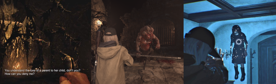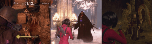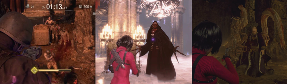 You can also play the “Mercenaries” mini game to dispatch as many enemies as possible against a time limit, building up your “Mayhem Meter” to unleash character-specific special moves and playing as either Leon, Luis, Krauser, or the returning HUNK, each with their own weapon loadouts and attributes. DLC packs also contain funky extra costumes, weapons, and even the original game’s soundtrack. Finally, there’s the Separate Ways side story that focuses on what Ada was up to during the main game and comes with seven additional Achievements. Separate Ways has been expanded upon in many ways. Not only does Ada have access to the same weapons, knives, items, crafting, treasure, and abilities as Leon (including the Merchant and her own melee attacks) but her grapnel gun now plays a significant part in her gameplay. You’ll often be prompted to grapple to (or find yourself traversing) the rooftops and upper levels in recycled locations, tapping RB to swing across gaps, launch to ledges, and even remove shields from enemies and fly in for a quick melee attack once upgraded. Separate Ways also expands upon Luis’s story, teaming him with Ada at various points, and she utilises her ocular I.R.I.S. implants to track footprints and reveal fingerprints for keycodes. Separate Ways also adds content back into the game, including the laser hallway sequence (a simple QTE where you tap B a few times and the RB at the end, finishing off a gigantic, toad-like boss at the same time) and U-3 boss fight. This returns as the final form of Ada’s clingy stalker, the gruesome Black Robe, which distorts the environment, teleports and creates duplicates, and is fought numerous times before it transforms into this scorpion-like form for a two-phase showdown in the caverns. Ada also battles Garradors, Regenerators and Iron Maidens (without the benefit of the infrared scope, that I could find), and boar-headed brutes with machine guns strapped to their arms. She also tackles an El Gigante (battling from atop destructible huts) and has a unique showdown with Saddler. This was the most frustrating part of Separate Ways for me. Saddler has a rush attack, bursts tentacles from the ground, fires bullets from his fingers, and can spam-lock you with tentacle combos. You must blast his face until the eyeball appears in his mouth and keep firing until you can melee attack him, but this took me quite a few tries. After that, you must grapple around the final stage as Saddler’s Lovecraftian mass attacks Leon, blasting the eye tumours in its tentacles to reach the rocket launcher and bring the side-game to a close. Separate Ways has the same difficulty settings as the main game and you can unlock additional costumes and accessories to wear in it, and the main game, as well as complete similar challenges when playing.