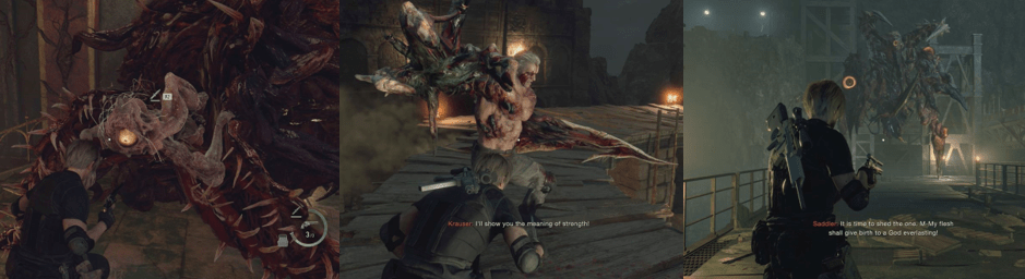 Bitores Mendez once again hounds Leon throughout the story, though you are spared him lumbering after you like a Mr. X or Nemesis figure. He’s still fought in a burning barn, assuming a scorpion-like mutated form where he swipes with his tentacles, requiring you to either dodge or parry his limbs to blast at his big, ugly eye. In the second phase, the fires rage out of control and can really eat away at your health, as can the barrels he tosses at you, but the key is staying in the safest place you can find, parrying when prompted, and hitting RT when he’s stunned to deal big damage. Ramon Salazar’s mutated plant form is more agile than I remember it. He scuttles about on the walls and ceilings, belching corrosive bile and explosive pods, and can eat you in one bite if he gets too close. You need to constantly stay on the move and not miss the opportunity to fire when the pod opens and reveals him, which will eventually stun him to the ground so you can use your knife, but I found this a particularly gruelling boss battle. Krauser is fought twice this time; the first is a straight-up knife fight where you must parry or dodge his attacks, landing slashes and melee attacks until he flees. This repeats in the ruins, but Krauser also fires at you, tosses flash grenades, and mutates a giant arm blade for the finale. The fight isn’t timed this time, but Krauser is extremely agile, so you’ll need to keep him in view, taking shots and using any nearby knives to parry his slashes while also getting around his bio-organic shield. Finally, Osmund Saddler transforms into a rampaging, tumour-filled arachnid monster that stomps about an unstable mining platform. For such a big creature, it’s difficult getting a good shot at the eye-like growths on his limbs but doing so leaves his main weak spot open. Repeat this a few times, watching out for the limited ground, and Ada Wong will eventually toss you a rocket launcher to finish him off after he envelops the entire arena in a mess of putrid limbs.