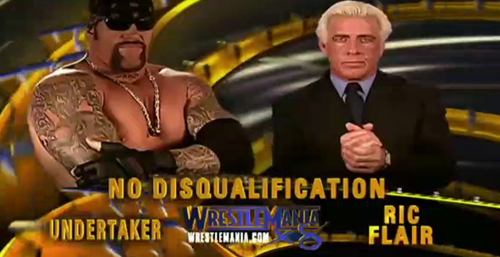 Digging deep into his repertoire of dirty tricks, Flair crotched the Undertaker on the top rope and knock him to the outside again. This time, Flair grabbed a lead pipe from the Undertaker’s bike and bashed Big Evil right between the eyes, busting him open as well. Flair continued to bludgeon his foe but the Undertaker quickly regained control by running Flair into the ring apron and barricade, only for the Nature Boy to strike back with shots from a safety sign retrieved from the aisleway. Flair, his confidence growing, sneaked a couple of “Woo!”s and struts in and lived up to his reputation as the “Dirtiest Player in the Game” by kicking the Undertaker in the balls when Big Evil went for a Chokeslam. Flair then tied the Undertaker up in his signature Figure Four Leglock, finally waking up the crowd, but the Undertaker simply powered out and countered with a falling Chokeslam for a near fall. Frustrated by Flair’s defiance, the Undertaker took his aggression out on referee Charles Robinson but got drilled when Arn Anderson, the enforcer of Flair’s legendary Four Horsemen stable, rushed the ring and planted him with his signature Spinebuster! However, thanks to the referee being incapacitated, Big Evil kicked out (though this sequence well and truly got the crowd invested in the match). The Undertaker attacked Double-A and trapped him in the Dragon Sleeper (for my money, a far better submission move than his later Hell’s Gate) but Flair saved his friend by walloping Big Evil with a steel chair. Although the Undertaker easily shrugged it off, he struggled to hoist Flair up for the Last Ride so he settled for a Tombstone Piledriver to mercifully bring this to an end and bring his WrestleMania streak to 10-0. Sadly, this wasn’t the best match for either men; apparently, Flair was unsure if he should even be in the ring at the time and credits the Undertaker with renewing his confidence, but this was a chore to sit through. It was just the Undertaker beating up a defenceless old man for about half an hour; Flair barely got in any offense and, when he did, it was all chops and weapon attacks. The best part of this match is Arn Anderson’s surprise run-in. Watching this as a kid, at a time when the Undertaker’s winning streak wasn’t as big a deal as it would later become, I was certain that would be the finish but it wasn’t to be and that was probably for the best as this would’ve been a pretty lame match to go out on.