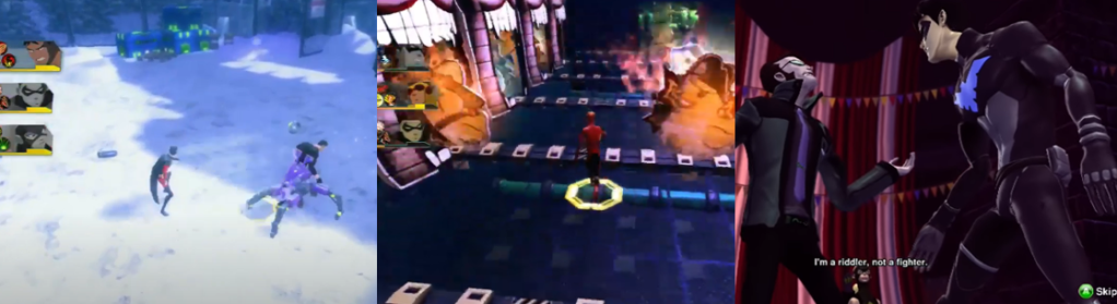 As in the Batman: Arkham games, Gotham City is ravaged by a contingent of criminals, all of whom are loyal to one gang or another. You’ll encounter “Freaks”, street punks who follow Harley’s lead, the Regulators, who wield tech and often use Mr. Freeze’s toys, be attacked out of the blue by the League of Assassin’s ninjas and stir up the Court of Owl’s zombie-like Talons in their nests. Enemies come in different types, from regular grunts to ones with weapons (Molotov cocktails, rifles, freeze or electrical weapons, and even annoying drones), and bigger enemies who have shields or can tank your hits. Each gang has these different types of enemies so, if you fight three different types of Regulators, you’ll encounter similar versions when fighting the Freaks, though they do look different. The bigger Freaks have large metal shields and sometimes maces, for example, whereas the larger Talons wear ceremonial armour and carry axes and the larger Regulators can create an electrifying area attack. Generally, they all go down quite easily once you get the hang of combat; you can dodge out of the way of their attacks and gunfire, which also seems to damage enemies, and take advantage of any interactable elements to stun or defeat them, but things can get quite hectic as enemies mix and match and you take on waves of them to complete objectives or defend endangered Gothamites. You’ll also have to avoid the GCPD; police officers are often in the streets or will arrive at crime scenes after you’ve cleared out enemies; they won’t hesitate to shoot or chase you and you won’t gain experience points (XP) from taking them out, so it’s better to just avoid them.