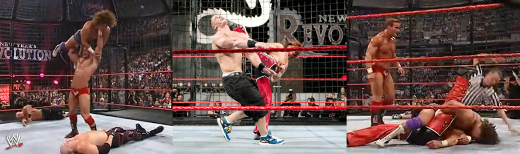 I was really into WWE at this time, primarily because my family had finally gotten Sky so I could watch SmackDown! Thus, I was pretty biased towards the Blue Brand and rightfully so as they had the better competitors and in-ring action, but Raw was always treated as the bigger show. This sentiment is reflected in the boneheaded decision to have the entire commentary team working this match, leading to distracting arguments between the embittered SmackDown! commentators (who also dominated the commentary as they were the superior duo) and their Raw counterparts, who were outclassed by their impassioned colleagues. Although Batista was eager to start and lead by his example, his concerned teammates convinced him to wait on the apron due to his injured shoulder, leaving upstart Randy Orton to start against Shawn Michaels, who had both upset each other in the build. They shoved each other into opposite corners before the arrogant Orton slapped HBK, prompting Shawn to slap him right back and humble the youngster with a flurry of take downs. As Tazz laid into Styles and the Raw commentary team, Orton worked over HBK for a near fall but missed a knee drop, allowing HBK to tag in Chris Masters. Masters dominated Orton with his bulk, forcing JBL to break up a pin fall and leading Orton to tag in Bobby Lashley. The two big boys charged each other and proved equally unmovable and, though Lashley crashed into the corner off a splash, he fought off the Master Lock and planted Masters with a belly-to-belly suplex. Carlito begged off when Masters forcibly tagged him in, leading Lashley to drill him with a powerslam and send him scrambling to HBK for a tag.