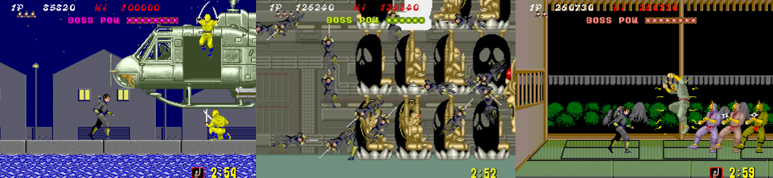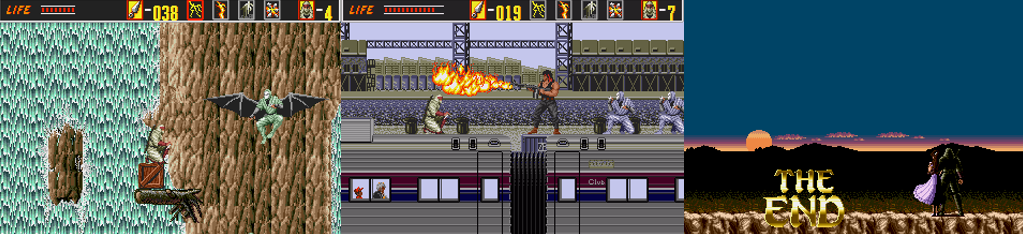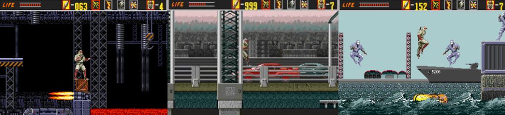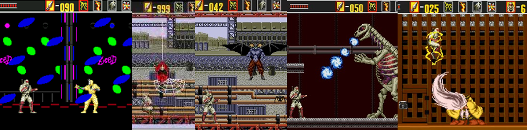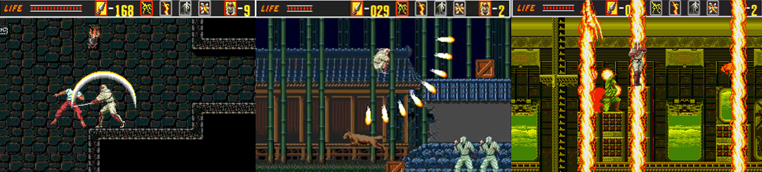 Despite their superior numbers and deadly weapons, Musashi triumphs but is frustrated when the final foe reveals Naoko isn’t in the pavilion and that he has been lured into a trap. Despite being warned of formidable martial artists awaiting him in the pavilion, Musashi descends downwards undeterred and meets an elderly warrior who presents himself as an ally and impresses Shinobi with his deft skill. Reagrdless of the threat, and the elder’s surprising speed, Musashi eventually ties the holy man up in his own robes, leaving him cursing on the floor. Next, Musashi comes across an elaborate stage and a Neo Zeed assassin painted like the Monkey King, a kabuki character renowned in Chinese opera for his kung-fu prowess. Attacking with a viciousness befitting of his clan and throwing Musashi off with his “monkey-style kung-fu”, the Monkey King proves a formidable threat…until Musashi rams the hilt of his sword into the foe’s gut, leaving him a winded and blubbering mess. On the next level of the titular fear pavilion, Musashi meets a muscular warrior who stomps about with stilts strapped to his legs. As if the additional power and reach offered by these appendages wasn’t enough, the fighter also mocks Musashi’s size and skill, breaking a few of Shinobi’s ribs, though Musashi cuts the warrior down to size and limps on. In the next room, Musashi is stunned to find Naoko waiting for him in an unguarded room, cautious despite his haregai not detecting any threat. His wariness turns out to be true as “Naoko” reveals herself to be “Water”, one of the legendary “Four Elements” who control Neo Zeed. Unprepared to face one of Neo Zeed’s daunting commanders and realising that he’s not only outmatched but that Naoko isn’t in the pavilion, Shinobi tosses a smoke bomb and flees from the hazardous pagoda, vowing to confront his enemy on equal ground later.