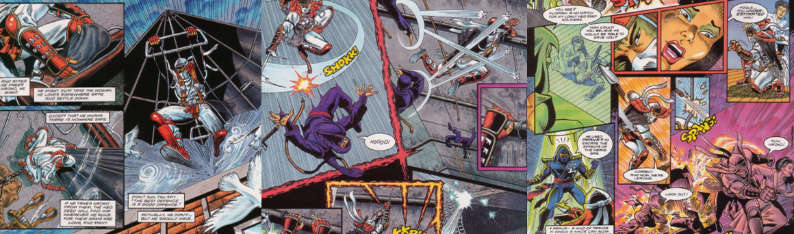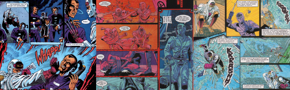 Indeed, even Musashi scoffs at mysticism throughout these stories, which is a bit odd considering he utilises magic in the Shinobi games and later draws strength from the prana to match the Void’s iron hand technique and utilises chi to counteract the poison fist technique. Portrayed as a cunning and talented swordsman, Musashi is also a master of disguise, dressing up as an old man to case out Neo Zeed’s headquarters and Mitsugi’s casino and even stealing a ninja’s uniform at one point. Sure, he’s regularly discovered, or his deception is anticipated, but I appreciated the effort, at least. Musashi also has a fair few tricks up his sleeve; he doesn’t have his surfboard or canine companion, but he does use a hang glider, smoke bombs, and flash grenades. Although the stories focus more on their own narrative, one heavily inspired by The Revenge of Shinobi, a few elements from the videogame appear. Musashi deflects shuriken like in the opening, slashes his sword as he does during combat, and performs his rolling somersault, though very few of the enemies he faces or the locations he visits are from the games. This is a bit of a shame as it would’ve been nice to see the bosses used in place of the Four Elements and the masked Ninja Master instead the Void. Musashi’s primary goal is rescuing Naoko and bringing down Neo Zeed, just like in the videogame, though he encounters no knock-off characters, supercomputers, or robots here. He’s pretty much exclusively fighting ninjas, as in the original Shinobi, and is generally depicted as being superior to every foe thanks to his Bushido skills. Musashi fights with grace and intelligence, rarely blundering in head-first and never letting his emotions overwhelm him. Occasionally, his resolve does falter, such as when Water masquerades as Naoko or Kotomi-Sensei is endangered, but even then Shinobi gathers his strength and senses to fight back or retreats to regroup and return all the stronger.
