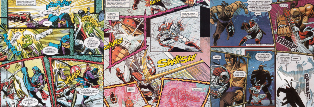 While Neo Zeed’s ninjas are no match for Shinobi, Musashi faces an uphill battle since he takes on the ninja clan alone. In “The Dark Circle”, Musashi’s haregai is rendered mute against his assailant’s speed and smoke and, unlike Shinobi, Neo Zeed are happy to kill, with the Monkey Kong proving an especially aggressive and dangerous foe due to his wild fighting stile. The stilt fighter also causes Musashi trouble, as does the old man waiting in “The Fear Pavilion”, though Musashi’s quest always drives him to overcome pain, superior numbers, and even more powerful opponents. While Neo Zeed rigorously trains its members and their locations are filled with traps and martial arts masters, Musashi’s rarely on the backfoot and, even when he is, it’s always revealed to be a ruse by his prana. While the Void is portrayed as a significant threat and certainly has an imposing presence, bossing about the Four Elements and displaying mystical power, he’s left broken and humbled by Musashi simply fighting better. The Four Elements are equally spoken of in hushed tones and Musashi even flees when ambushed by Water, but they’re painfully one note and their threat diminishes over time. Air and Water are given more dialogue and chances to match skills with Shinobi, who tires of their antics, meaning the surprisingly lethal Fire and the hulking Earth toil in the background. Mitsugi is by far the worst villain, happily lording over his criminal empire in ignorance and eager to learn more about Musashi despite literally having the Shinobi tattooed on his chest! It’s telling that Mitsugi vanishes halfway through “The Power of the Elements”; maybe he was to return in a future Shinobi story, as hinted at in the final text box, or maybe he was just a weak ass crime lord who took space away from the visually more engaging Four Elements. While Shinobi had a decent run in StC and there are some enjoyable elements to these strips, I can’t say I missed his presence after the stories ended, despite the loose ends left hanging at the end. There are far better backup stories based on SEGA properties in StC, but at least SEGA bothered to license the character and try and keep him relevant, which is more than can be said of how he’s been treated since the nineties!