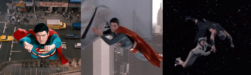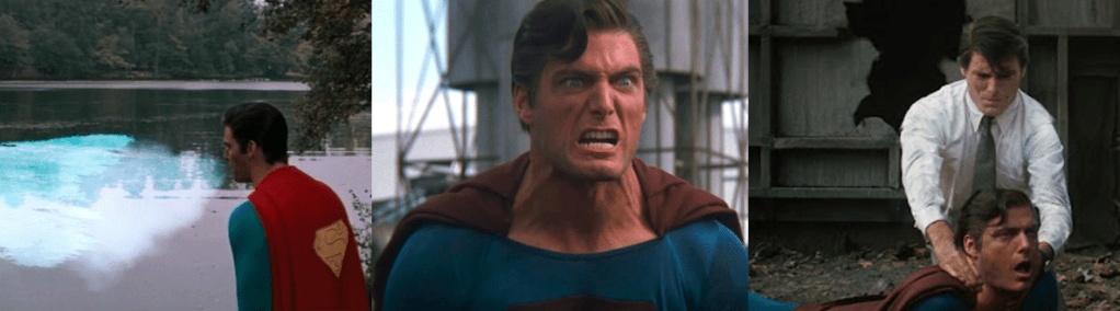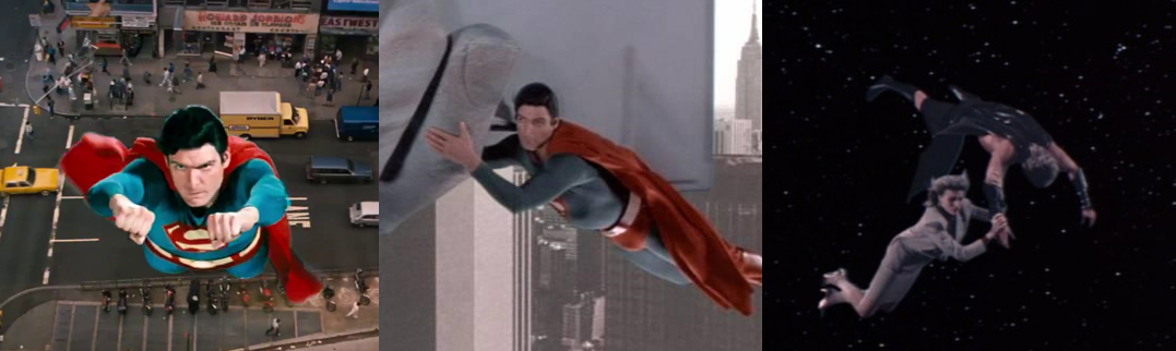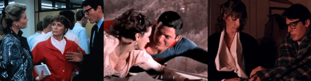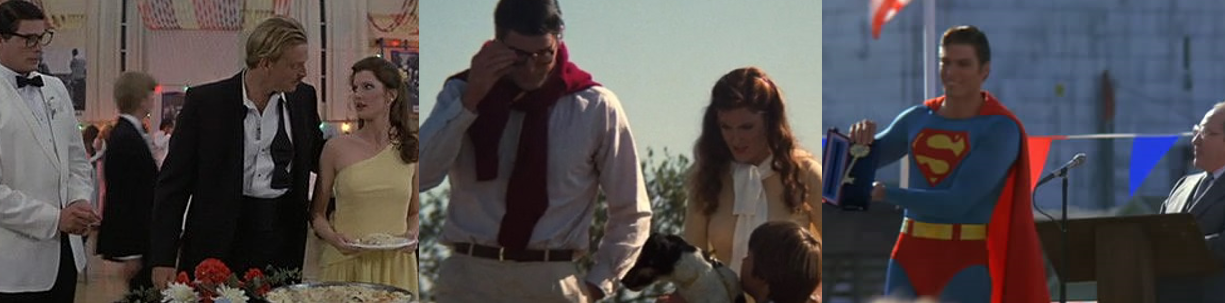 Although Lana Lang (Annette O’Toole) is sadly missing from the film and no mention is made of her, an awkward love triangle (more like a love square, I guess) does become a sub-plot of the film when newcomer Lacy takes a shine to Clark Kent. This leads to such “hilarious” moments as Clark visiting a gym with Lacy and feigning difficulty with the machines, and a laughable sequence where Clark and Lacy double date with Lois Lane (Kidder) and Superman, forcing Clark to dive in and out of costume to keep both women happy before thankfully being called away by a greater threat. The film even unashamedly rips off the Superman/Lois romance from the first two films; having a crisis of conscience regarding the world’s nuclear crisis, Clark reveals his identity to Lois, takes her on a terribly composited flight around the world, and asks for her advice before wiping her memory once again. While there is a poignant moment to be found here when Clark laments how unfair it is that he is forced to share himself with the entire world rather than the woman he loves, this largely amounts to an uncomfortable bit of selfishness on Superman’s part since he freely toys with Lois’s emotions and her memory rather than finding a less invasive way of decided what he should do about the looming threat of nuclear war.