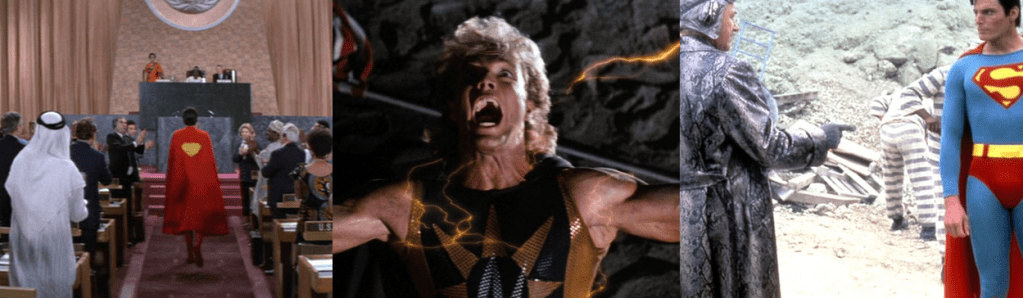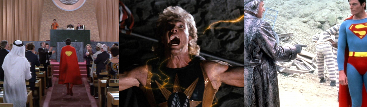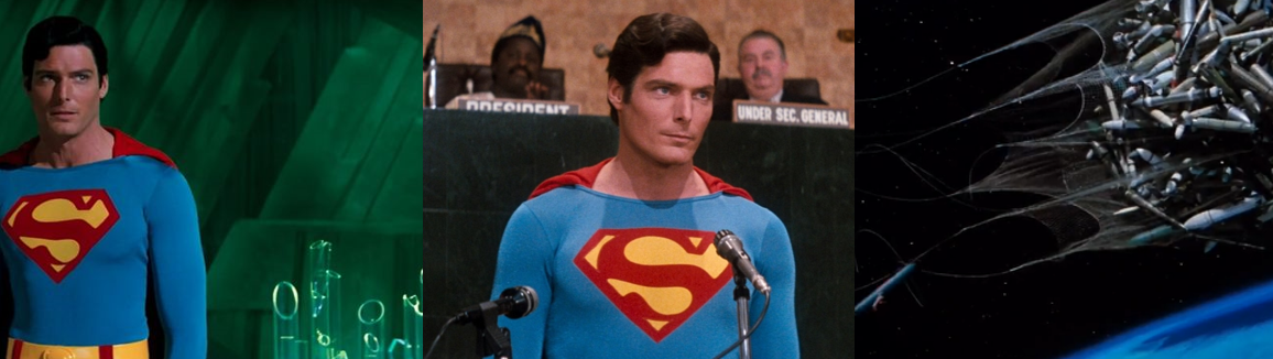 Indeed, perhaps the film’s most promising and appealing element is the question of worldwide nuclear destruction; I know a lingering fear I’ve always had about our world is the presence of nuclear weapons, just one of which could cause a cataclysmic disaster that could end all life on the planet, and tackling this issue with Superman has a lot of potential that really deserves to be in a better movie. When begged to intervene in the nuclear arms race, Superman finds himself torn between his morals since the ghosts of the Kryptonian council vehemently forbid him from interfering in human history. Ultimately, however, Superman decides that he loves the Earth too much to see it go the same way as Krypton and announces to the world’s governments that he is going to rid the planet of all nuclear weapons. He does this by, of course, having them all shot into space so he can gather them up in a giant net and hurl them into the Sun, an ingenious solution that potentially means the world should calm down into a semi-utopia but actually gives birth to a supervillain whose powers match (and, in many ways, surpass) Superman’s.