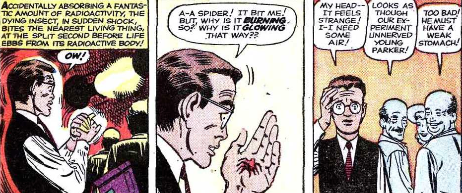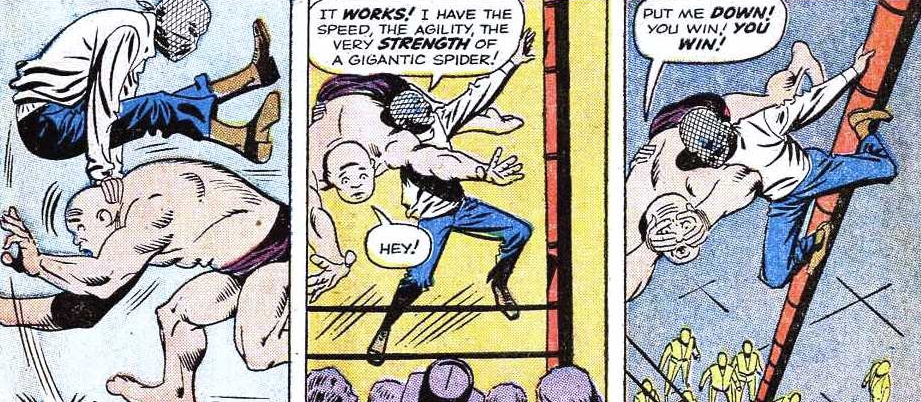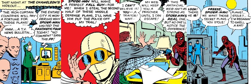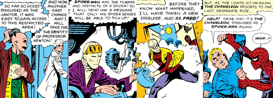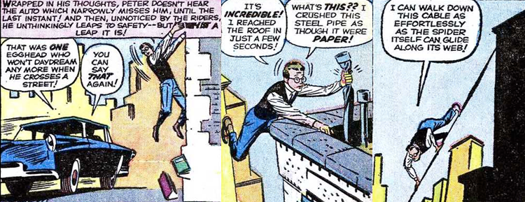 Offended when the abrasive Sandman tries to brush him off like he’s nothing, Spider-Man moves to subdue the crook and is astonished when the Sandman literally slips through his fingers by turning his body into soft sand! The Sandman mocks Spider-Man as the wall-crawler’s punches go right through his body and when Spidey damn-near breaks his hand when the Sandman hardens his body to the consistency of iron, and his fully malleable body sends him reeling across the rooftop! Frustrated by the Sandman’s taunting and shape-shifting shenanigans, Spider-Man prepares to try his webbing on the crook but is startled to find that his mask has (somehow…) ripped during the fight. This sends his anxiety and paranoia into overdrive; Spidey envisions that capturing the Sandman will expose his secret identity, leading to an increased manhunt spearheaded by Jameson and the destitution of be beloved Aunt May. Of course, there’s nothing to suggest this would actually happen; there’s no way that the Sandman knows who Peter Parker is, after all, and he could just cobble together a substitute mask, but Spider-Man decides that the risk is just too great and flees before the Sandman can get a good look at him. This leaves the Sandman free to easily deposit himself at ground level, break into the bank by forming the exact shape of the key with his finger, and slip into the vault by turning his entire body into sand. Back at home, Peter frets about his sewing skills while watching a news report that’s conveniently expositing the Sandman’s bizarre origin story: career criminal Flint Marko escaped from solitary confinement in a maximum security prison on an island, swam to shore, and hid from the ensuring manhunt at an atomic device testing centre. There, he was caught in an atomic explosion and, rather than being immolated or suffering from gruesome cancer, his molecules were radioactively merged with that of the sand at his feet, transforming him into a veritably indestructible man of sand.
