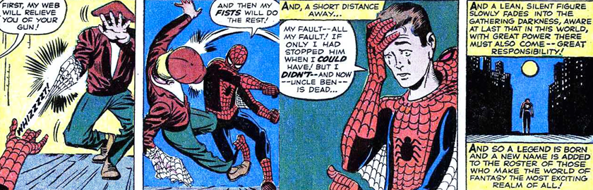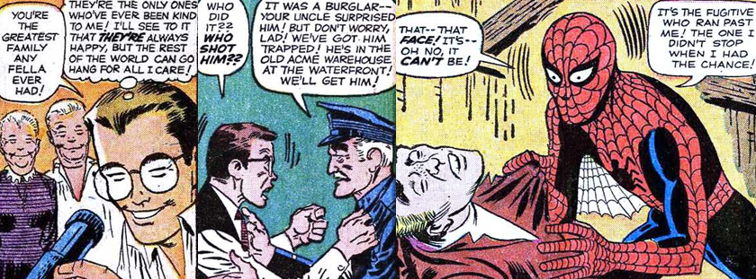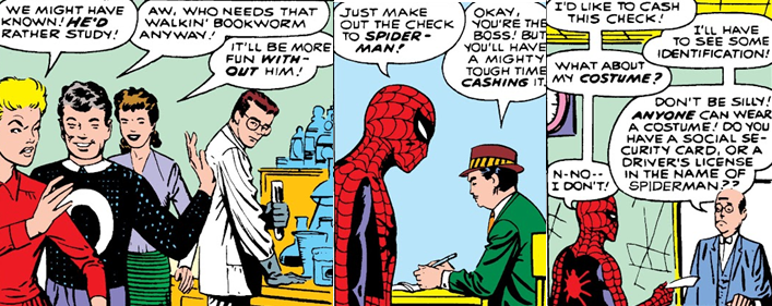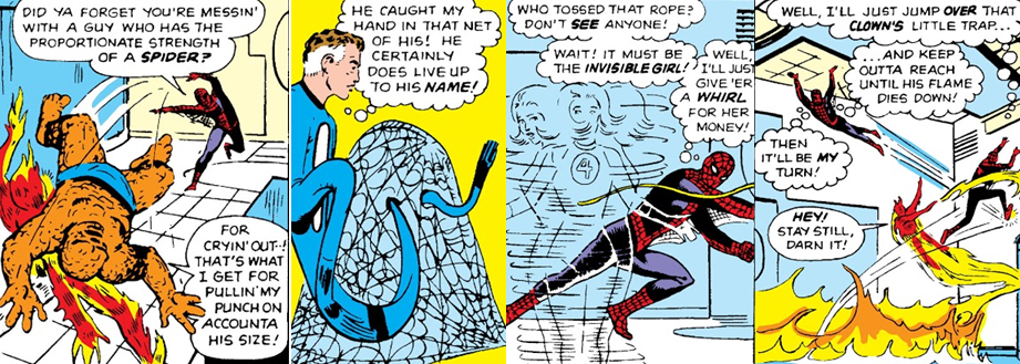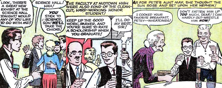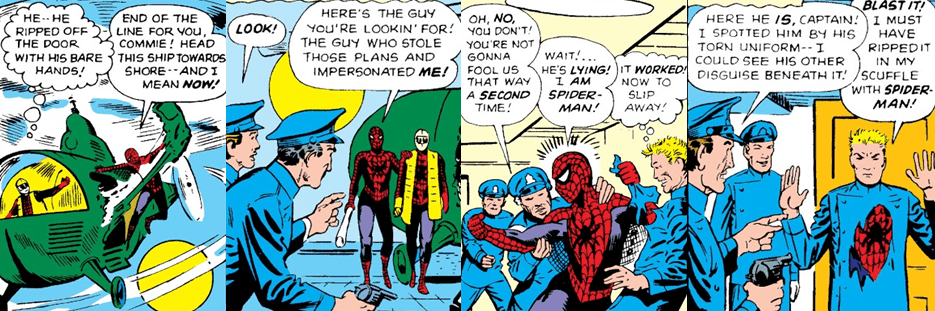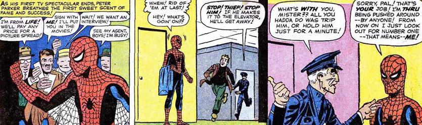 Wow, Stan Lee really didn’t pull any punches in piling the pressure on young Peter Parker back in the day, did he? Peter has got to be the unluckiest guy in the world; it seems no matter what he does, the world is out to get him. It’s almost laughable at times, and especially in this story; Spider-Man’s busted up would-be crooks before and it’s never been a problem, but this time they threaten him with legal action as he jumps in too soon. Although he beats himself up over this, this mistake doesn’t stop him confronting the Sandman, which I think was a missed opportunity. If Spider-Man had spotted the Sandman and not intervened based on what just happened, Peter could’ve wallowed in self-pity not unlike the guilt he feels over Uncle Ben’s death when he later learned that the Sandman robbed that bank. Instead, we get this really random interlude where Spidey’s forced to run off because his mask rips (I still don’t see how that happened…) and he’s taken out of action by the suffocating affections of Aunt May. Then, rather than get out there and look for the Sandman, he’s scolded by his peers, subjected to abuse by the likes of Flash and the fickle Liz, and all his efforts to subdue the Sandman ultimately amount to nothing as Jameson is so determined to paint him as a menace. It’s really weird, though, as the kids at his high school are cheering him on and even the cops seem willing to give Spider-Man the benefit of the doubt, but the general public are easily swayed by Jameson’s biased opinions all so that Peter can be weighed down by depression and self-doubt. This already weighs so heavily on him that he totally overreacts when his mask rips and is immediately and irrationally convinced that it’ll mean the end of his life, even though the Sandman surely won’t know him from any other kid!