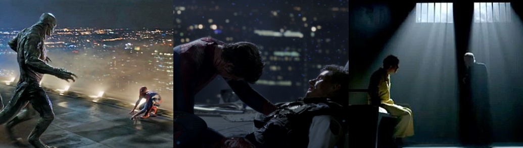 Desperate to avoid his father’s fate, Harry begs first Peter and then Spider-Man for help and is enraged when he’s denied, believing Spidey is a fraud despite him reasonably worrying about the effect his blood would have on the emotional Osborn. After being double-crossed by Menken, Harry begs Max to help him access Oscorp’s hidden bunker, where he forces Menken to inject him with a serum derived from Richard’s spiders, believing it to be a “cure”, only to be horrifically mutated as it both accelerates his condition and further alters him. Luckily, a convenient “healing” battlesuit keeps Harry from dying but the whole ordeal drives him as batty as Max, whose reward for helping is the freedom to absorb power from the electrical grid he created and was denied credit for to plunge the city into darkness and strike back at everyone who ignored him and idolised Spider-Man. Peter and Gwen’s reconciliation is interrupted by Electro’s revenge and Gwen insists on helping Spider-Man, putting herself in danger despite his protests. Spidey holds off Electro, done trying to reason with him, and risks his life grounding the misguided villain so Gwen can overload and seemingly destroy Electro. Their victory is short-lived, however, as the now demonic Harry swoops in on an Oscorp glider looking for revenge, figures out that Peter is Spider-Man, and spitefully threatens Gwen. This leads to a short and sadly rushed (but also brutal fight) between Spider-Man and the cackling Green Goblin that ultimately ends with Harry being knocked out and Gwen plummeting down a bell tower. Despite Peter’s best efforts and a heart wrenching image of him (and his webbing) reaching for her in freefall, Gwen suffers a similar (but far more horrific) fatal fall and Peter is left devastated. So much so that he spends five months so stricken by grief than he constantly visits Gwen’s graves and denounces Spide-Man. However, Peter suits up once more after a pep talk from Aunt May, reviewing Gwen’s speech about embracing life, and to confront the Rhino. Oh, and that mysterious gentleman (Michael Massee) also colludes with the incarcerated Harry to recruit a few individuals to use Oscorp’s secret projects to destroy Spider-Man.