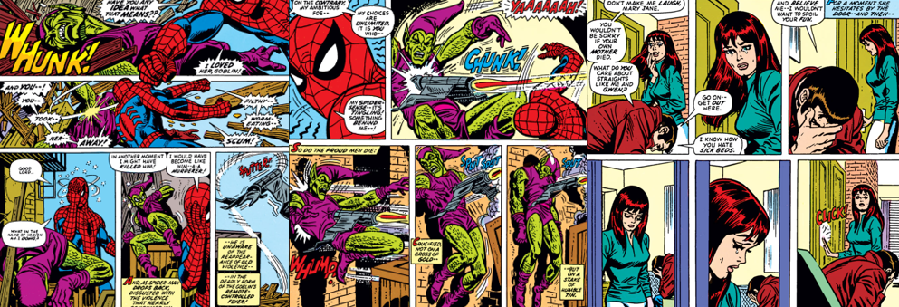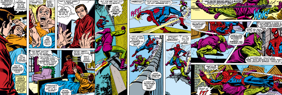 Peter’s grief causes him to fly into an uncharacteristic rage. It’s widely said that Spider-Man means business when he drops the inane quips and, indeed, Peter adopts a more violent approach when tracking down and confronting the maniacal Green Goblin. He shuns his best friend, shuts down the petulant J. Jonah Jameson’s, and races to the Green Goblin’s location with murder on his mind. The resulting rematch is an aggressive affair where Spidey eschews all sympathy for his crazed foe and berates his spiteful, vindictive nature. When Spider-Man damages the glider, the Green Goblin enrages the wall-crawler by showing more concern for his toys than a human life and, true to his word, Spider-Man seems ready to beat the Green Goblin to death. However, logic and reason hit Spider-Man like a brick wall and, disgusted by his actions, he pulls back at the last second. This hesitation is seen by the Green Goblin as a weakness but it’s the fundamental difference between the two rivals: one is a murderous lunatic who gleefully tortures and kills and the other is a righteous hero, who sacrifices his own personal needs to protect others. The Green Goblin’s stubborn and wicked nature ultimately prove his undoing as he’s impaled by his glider in a surprisingly harrowing death scene, especially for the time. The moment is framed as sudden and hollow, with Spider-Man getting no pleasure or closure in the deed and only being further convinced that “an eye for an eye” is the furthest thing from justice. For me, this was the perfect way to kill off Norman Osborn and I’ve been salty for decades that he inexplicably survived. It was thematically fitting for Harry to take up the Green Goblin mantle and be similarly undone, and we had plenty of look-a-likes and Hobgoblins running around so I could’ve done with leaving the Osborns in the grave. However, that doesn’t diminish the impact of his death as presented here, or of these two issues. Gwen’s death rocked Spider-Man and haunted him for years; it raised the stakes faced by all comic book characters and changed the industry forever. The ambiguity of the event and the way it weighs on Spider-Man’s conscience are disturbing and I do think the right decision as made since Gwen couldn’t compete with M.J. Subsequent stories have also constantly reinforced that Gwen was his first true love, ensuring a legacy that’s far more potent than if she’d been left alive.