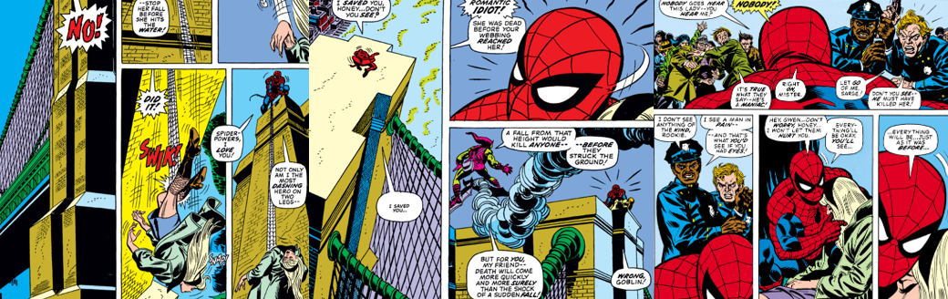 Spider-Man’s journey home is delayed by his illness, meaning he arrives too late to help and finds only Gwen’s handbag and one of the Green Goblin’s pumpkin bombs. Intuiting that Osborn’s returned to his violent alter ego and concerned for Gwen’s safety, Spider-Man follows his spider-sense to the George Washington Bridge. There, he finds the Green Goblin perched an archway with Gwen’s presumably unconscious body at his feet. The Green Goblin threatens to kill Gwen unless Spider-Man indulges in a final confrontation, to the death (naturally), and, angered at his girlfriend being targeted, Spidey readily agrees. Thrown by his flu, Spidey barely dodges a pumpkin bomb and is bashed by the raving Green Goblin’s glider. Luckily, Spider-Man snags his foe with his webbing and lands a huge left hook that sends the Green Goblin plummeting. Confident that his enemy is subdued for the time being, Spidey races to his unconscious lover, assuming she’s in shock, and is horrified when the Green Goblin makes a sudden recovery and spitefully knocks Gwen from the bridge! Desperate to save her, Spider-Man shoots a web line and is so elated when it snags on Gwen’s ankle that he misses the small Snap! at her neck… Congratulating himself, Spidey pulls Gwen up and embraces her, still clinging to denial, only to find Gwen doesn’t respond and is, in fact, dead despite his best efforts. Spotting the Green Goblin hovering nearby, Spidey sets Gwen safely on the ground and vows to make Osborn pay with his life for crossing the line. Attacking with a self-righteous fury, Spider-Man violently beats his foe, doubling down when the Green Goblin seemingly begs for mercy.