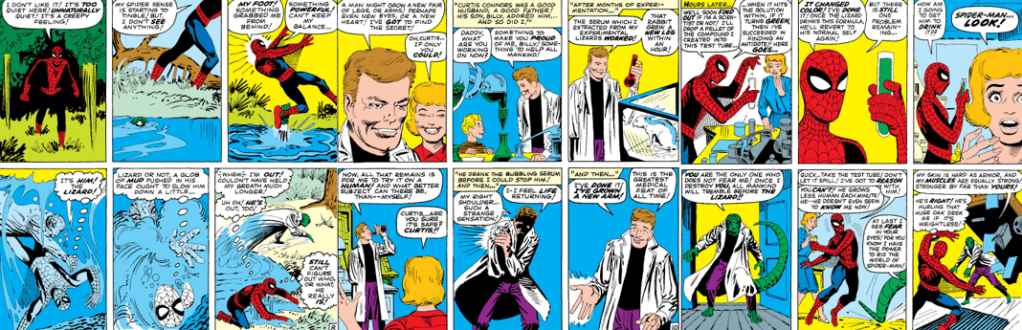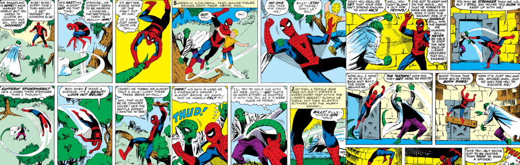 Thanks to his scientific acumen, Spider-Man is successful and, right on cue, the Lizard attacks the lab. Overwhelmed by the creature’s speed, ferocity, and incredible strength, Spider-Man is beaten unconscious, allowing the Lizard to retrieve his serum to empower the local lizards in a mad plot to conquer the Earth. With no time to call for help and no choice but to pursue, Spidey whips up a pair of “web swamp-shoes” and goes paddling through the stream into the Lizard’s territory, pondering how he’s going to subdue the Lizard without harming Dr. Connors. Reaching an abandoned fort, Spider-Man spots the Lizard monologing to a congregation of alligators, who listen intently and obey his every command, attacking Spider-Man when instructed and forcing the hero to scale the fort’s tower to escape. Determined to keep the Lizard distracted, Spider-Man throws webs and his quick wit at the creature and stays on the move, eventually trapping them both within the fort. When the Lizard pursues him up the walls, Spidey makes a desperate gamble and plunges to the ground, tackling the Lizard in mid-air and forcing the antidote down his throat. Spidey is stunned by the Lizard’s powerful tail and left powerless but, just as the Lizard moves to strike, the antidote takes effect. In a few panels, the Lizard’s transformation regresses and Dr. Connors returns, human and sane again (though still missing an arm) to reunite with his family. After Dr. Connors vows to destroy his research, Spidey takes pity on him and promises to keep his secret, much to their relief. In the aftermath, Jameson destroys the photos Peter brings him, convinced the Lizard was all made up and the trip was a waste. He therefore refuses to pay Peter, adds the cost of the trip to his bill and, to make matters worse, Peter’s shot down by Elizabeth “Liz” Allen since she’s got the hots for Spider-Man!