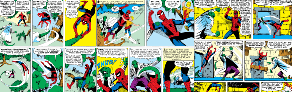 The Review: Our story opens in “the murky swamps of Florida’s everglades”, where a group of…well, I assume they’re tourists but one of them has a gun so maybe they’re poachers? Or perhaps they just have a well-prepared tour guide? It’s hard to tell and ultimately inconsequential. Anyway, a group of men are suddenly attacked by a giant, man-sized lizard in purple trousers and a lab coat. As if the sight of a six-foot lizard wasn’t shocking enough, the creature speaks (and quite eloquently, too), voicing rage and displeasure at the men for venturing into his swamp. After proving bulletproof, the Lizard causes the trespassers to flee by uprooting a massive tree and waving it about in a threatening manner. Further reports of additional encounters and attacks soon spread, leading the locals to avoid the swamplands and live in fear of the man-lizard in the region. The news is so astonishing that it even reaches the streets of New York, courtesy of the Daily Bugle, whose editor, the miserly J. Jonah Jameson, wastes no time using his publication to challenge Spider-Man to defeat the Lizard. Though he scoffs at the headline, Spider-Man reasons that he might be able to convince Jonah to send him to Florida to snap some pictures of the Lizard. However, Jonah shoots him down, primarily because he believes the whole thing’s a hoax anyway (making me question why he’d risk the Daily Bugle’s reputation printing the headline). Though dejected, Peter heads to the Natural History Museum to brush up on his lizard knowledge. During a lecture on dinosaur anatomy, Peter’s spider-sense alerts him to two thieves, who he quickly subdues, and he’s so bolstered by his actions that he decides to approach Jonah in his masked identity. Spider-Man humiliates Jonah in his office and accepts his challenge, but on the caveat that Jonah sends a photographer to capture the fight, however Peter’s plan backfires somewhat when Jonah insists on tagging along! After saying his farewells to his doting Aunt May, Peter takes his mind off the uncomfortable plane ride by researching Dr. Connors, a lizard expert in the Everglades who he tags as a possible source.