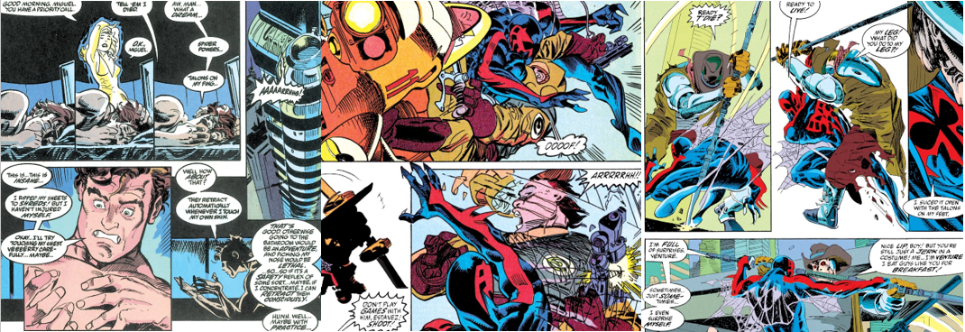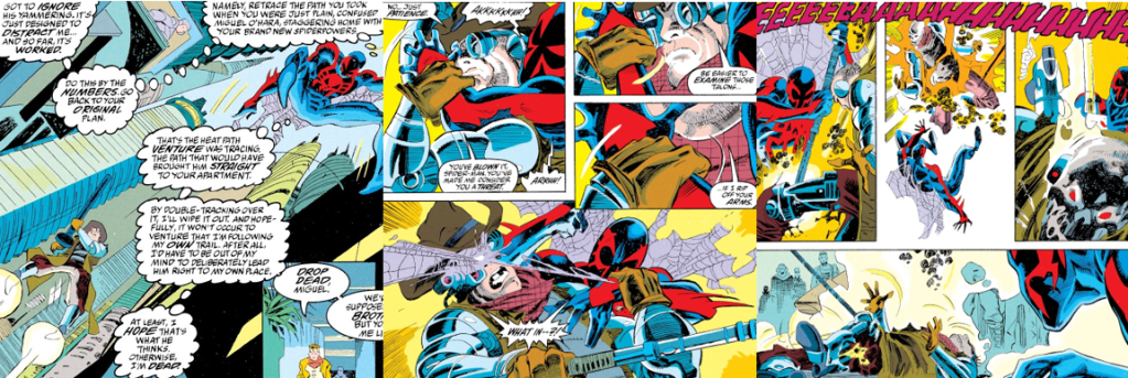 As intense and thought-provoking as the character interactions and themes of the movie are, Spider-Man: Across the Spider-Verse excels in its visuals. The film takes the unique frame rate and cartoonish, comic book-stylings of the first movie and ups the ante to make every Spider-Person feel unique. Gwen’s world is rendered very differently from Miles’s, being mostly pastels and having an almost brushstroke effect; Spider-Punk animates jerkily, like a living piece of Sex Pistols artwork, and the attention to detail in the animation, background details, and little things like thought boxes and sound effects popping up onscreen really add to the exhilarating, pop art appeal of the film. There are some gorgeous shots here, too, such as when Miles and Gwen sit upside down and gaze upon the inverted city, rain and night effects are used for fantastic dramatic detail, and I especially enjoyed how 2099 was brought to life as a sprawling, high-tech utopia above ground and a dark, depressing, neon-spawned underbelly below. This translates into the web-slinging, which is easily the best we’ve ever seen from a Spider-Man movie since the action is only limited to the animator’s imagination. All the Spider-People web-sling and fight differently, with the pregnant Jessica Drew doing her best Akira (Otomo, 1988) on her motorcycle and spewing webs from her fingertips, Spider-Punk leaping into battle with a guitar, and Pavitr incorporating a little wooden accessory into his webbing. For me, the standout in this regard was Spider-Man 2099; as morally reprehensible and ruthless as he appears, his fighting style and web-slinging are a force to be reckoned with. Utilising energy webs and sporting both talons, fangs, and bladed appendages alongside his bad-ass suit, Spider-Man 2099 is more feral than the other Spider-People and carves a swath of destruction in his pursuit of and attack upon Miles. Although clearly outmatched, Miles manages to elude and survive even Spider-Man 2099 thanks to being an “anomaly”; the spider that bit him wasn’t even from his Earth, making him unpredictable (and, for Miguel, potentially dangerous) and accounting for his ability to fend off multiple, more experienced Spider-People and exercise a moral integrity that’s sadly abandoned many of his counterparts.