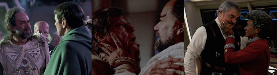 Though in a far better place, mentally, than in previous films, age is still taking its toll on Captain Kirk. Whereas “other men” have families to spend shore leave with, he spends his camping in Yosemite National Park with Spock and the miserly Doctor Leonard “Bones” McCoy (Kelley) since they don’t have anyone else. While Kirk fills his time with unnecessary risk-taking and Bones chastises Kirk’s foolhardy disrespect for life, Spock prefers to test his hoverboots and contemplate the lyrics of “Row, Row, Row Your Boat”. It’s while subtly mocking Spock’s misunderstanding of Earth customs that Kirk reveals a morbid belief that he’s destined to die alone, something which has left him somewhat emotionally empty and fearless. Despite his protestations about taking the malfunctioning Enterprise-A to address the hostage situation on Nimbus III, Kirk follows orders and finds new ways to get around the limitations of the script ship. He leads the away team in infiltrating the capital, only to find the hostages – the bitter St. John Talbot (David Warner), the disgraced General Korrd (Charles Cooper), and the alluring Caithlin Dar (Cynthia Gouw)) – have fallen under Sybok’s sway. Outmanned and outgunned, Kirk has no choice but to allow Sybok and the entranced diplomats safe passage to the Enterprise-A, where Sybok demonstrates his unique empathetic abilities. Even when faced with Sybok’s power, which causes visions of a person’s “hidden pain” to manifest visually, Kirk remains defiant. In one of the film’s best scenes (and of Shatner’s Star Trek career), Kirk launches into an impassioned tirade and vehemently rejects Sybok’s offer: “I don’t want my pain taken away! I need my pain!” Convinced that Sybok is a “con man”, at best, and “mad” at worst, Kirk both refuses to join him or co-operate and adamantly tries to talk him out of breaching the “Great Barrier” since Sybok claims to be on a mission from “God”. Kirk’s scepticism is briefly rocked when the Enterprise-A breaches the Great Barrier, but only for a moment. Just as he shrugged off Sybok’s allure, Kirk questions the authority and legitimacy of the “God” (George Murdock) they find on Sha Ka Ree. Again, Kirk feels untouchable, even when faced with a supposed deity, simply because he has not only seen more than enough to make him fearless and also because he’s “not alone” and therefore cannot die.