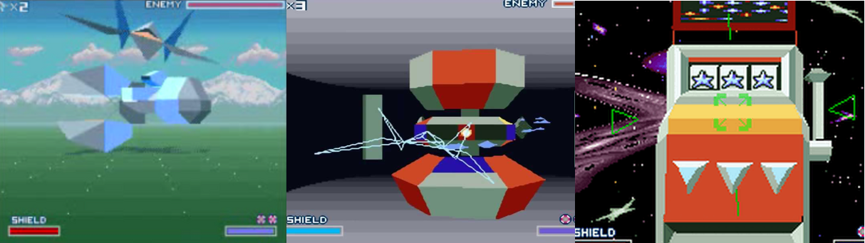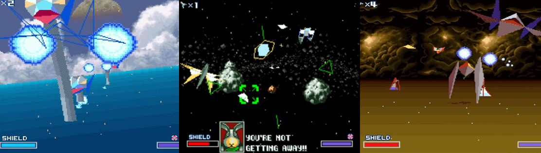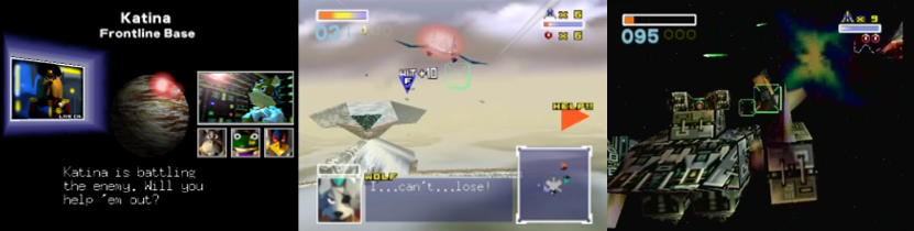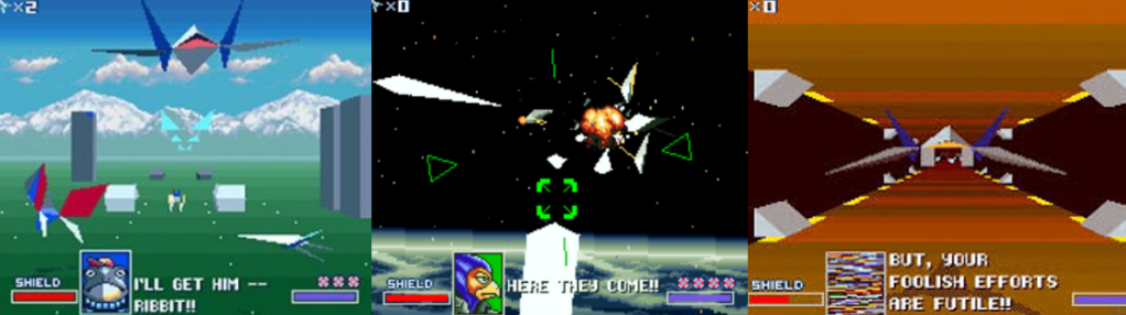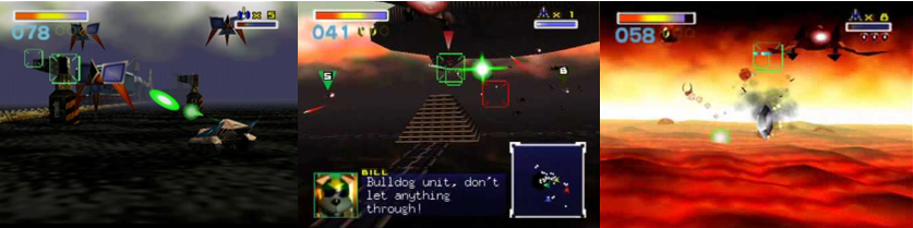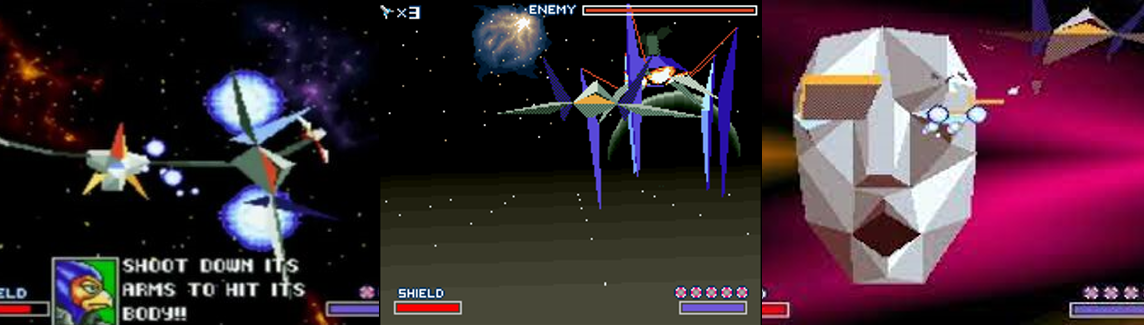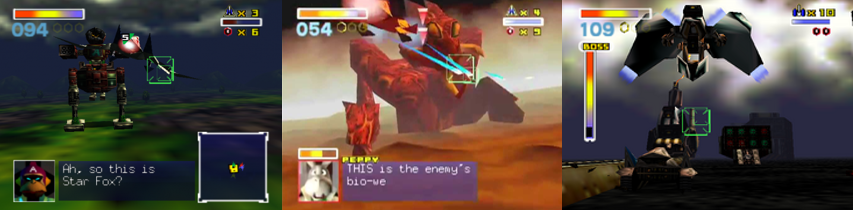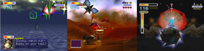 If there’s a downside to Star Fox 64, it’s mostly the enemies. Indistinct polygonal crafts of various sizes pop up, fly in, or swarm around each area, blasting at you or charging into you or chasing Slippy and forcing you to rescue her for the hundredth time. They’re easily shot down with your primary weapon but it’s recommended you charge a shot to take out multiple foes at once (and net yourself a power-up and a hit combo in the process). Turrets, mines (both land, sea, and space), towers, and bigger swarms become more frequent as you progress. Snake-like Moras weave throughout the Meteo asteroid field, whole swarms fill the screen with grid-like laser patterns, bee-like fighters dance about firing coloured rings, and winged craft rise from Solar’s burning depths. Some of the more interesting enemies are land-based, such as the Garudas (construction robots who topple buildings and toss girders at you) and the giant, crab-like walkers of Titania. Anime-like Shogun Troopers attack the Corerian fleet in Sector Y, disc-like defence station platforms and large battle cruisers act as both hazards and targets in Area 6, and you’ll be hard-pressed to destroy each section of the seemingly unstoppable train on Macbeth, especially while blasting tanks, towers, and through gates. As versatile as Andross’s forces are, often splitting apart and flying at you as horizontal and vertical hazards, his home world of Venom is rife with buzzing swarms, tight turns, explosive booby traps, and walls that sprout hazards at the command of the stone golem, Golemech.