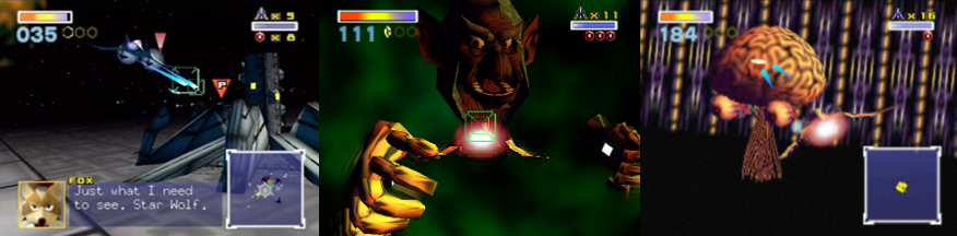 After taking out the security facility on Boise, you’ll infiltrate Andross’s pyramid-like base and chase down Golemech, blasting away his sandstone hide to attack his mechanical innards. You’ll battle the Spyborg in Sector X, which launches its fists at you and fires projectiles from its head. Take too long battling it and it’ll swipe Slippy to Titania, forcing you to rescue her from Goras, which has Slippy hostage in one pincer and fires lasers with the other. Target the limbs first, then switch to the chest and heart to bring it down. To finish Sector Y, you’ll chase down and destroy some super-fast Shogun Troopers and the larger, chrome-plated Shogun who eventually (and conveniently) settles atop an attack carrier and makes itself an easy target. The Gorgon super laser in Area 6 proved quite a challenge; you need to destroy its extendable tentacles and attack craft, then the three energy spheres inside it, all to finally expose its inner core multiple times over to succeed, By far your most persistent foes will be rival team Star Wolf, who you’ll face numerous times. Sometimes you can ignore them in favour of other objectives, but if you engage then you’re in for a tough dog fight. Star Wolf and his team love to come at you from behind and chase down your wingmen, and their ships have the same capabilities as yours, making them formidable foes. I found the battle against them on Venom particularly frustrating due to the enclosed space, them sporting shields to negate your charge shot and bombs, and Andrew Oikonny being a douche and not getting off my ass! No matter which path you take, you’ll end up facing Andross alone with Fox, though this giant disembodied ape head only shows his true form (a giant brain!) on the hardest path. Andross attacks by swiping his hands, firing an electrical blast from his fingertip, and sucking you in to eat you. Target his eyes to briefly stun him, destroy each hand in turn, and drop a bomb in his mouth and you’ll soon encounter his second form, a mechanical devil head that chomps at you. Destroying this is enough for the easy and medium paths, but the final form sees you desperately flying around blasting first Andross’s eyes and then the grey matter on the back of his brain as he teleports about, then desperately following Fox’s father as he leads you to safety.