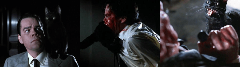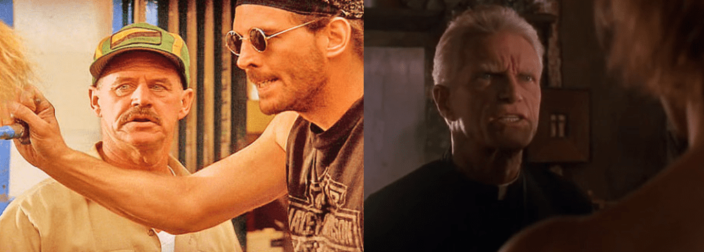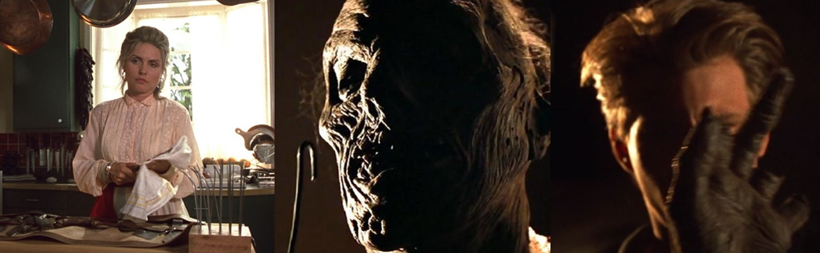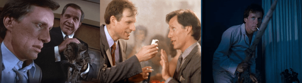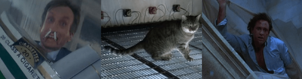 “They’re Creeping Up on You!” was probably my second favourite of the segments (“The Crate” is just too long for me to rate it at number two), but it still felt lacking at times. Pratt is a suitably deplorable excuse for a human being and I enjoyed seeing him squirm and get increasingly agitated as cockroaches swarm his germ-proof apartment. There definitely seems to be a suggestion of the supernatural here, even knowing how quickly cockroaches can infest buildings, as they increase the more he belittles others and delights in the death and grief he’s caused. Lenora’s calls, especially her ominous final message, suggest she is putting a death curse upon him, or that her husband is enacting a gruesome and fitting revenge for all the pain Pratt’s caused. Although Pratt’s corpse is also quite obviously a highly detailed dummy, it was quite unnerving to see the cockroaches burst through his skin and envelop him, with this final segment certainly bringing more of a creepy vibe to the proceedings as opposed to the black comedy and unsettling atmosphere of its predecessors. There’s something deeply disturbing about the usually jovial Leslie Nielsen coldly describing what he plans to do to Sam Malone, forcing Harry to bury himself in sand at gunpoint and watch his lover struggle against the tide. Richard has a madcap nature to him that makes him extremely unpredictable, with him coolly commanding every situation with a few curt words and threats rather than physical violence. It’s tough to pick whether Nathan Grantham was more cruel and vindictive than Billy as both are aggressive, patronising, and demanding individuals who push their victims to breaking point, meeting fitting ends as a result (though Nathan’s so stubborn and malicious that he literally returns from the dead to get his Father’s Day cake!)