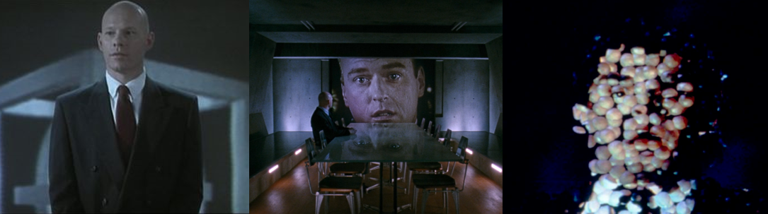 The final story, “They’re Creeping Up on You!”, forces us to share about twenty minutes with uncompromising, belligerent, and extremely wealthy businessman Upson Pratt (Marshall), a germaphobe who lives in a sparse, air-tight penthouse apartment and conducts all his business via telephone and computers. Pratt begins the story battling a cockroach infestation, spraying and stamping the bugs, demanding an exterminator, and threatening to rob people of their livelihoods if his demands are not met. Pratt is delighted to learn that his company’s recent successful corporate takeover resulted in the suicide of his business rival, Norman Castonmeyer, and dismissive towards Norman’s grieving widow, Lenora (Ann Muffly). When Lenora blames him for her husband’s death and wishes all kinds of pain upon the cruel entrepreneur, Pratt simply laughs, having fended off such insults all his life just as effectively as he’s stamped out bugs. Still, Pratt is increasingly disgusted and troubled by the cockroaches, which appear in his food, his equipment, and soon swarm throughout his apartment during a blackout. Having insulted an alienated anyone who could help him, Pratt never wavers in his desire to avenge himself on those who have subjected him to the infestation but is soon overrun by persistent bugs. In his panic, Pratt flees to a more secure panic room only to be mocked by another call from Lenora, who wishes death upon him, and promptly suffers a fatal heart attack upon seeing cockroaches scuttling around his bed. When the blackout lifts, the aggrieved, unsympathetic building handyman (David Early) stops by to check on the unresponsive Pratt. While the cockroaches seem to have disappeared, perhaps vanished now Norman’s death has been avenged or being manifestations of Pratt’s isolation and paranoia, they soon burst from his corpse, tearing through his skin and enveloping his shredded remains.