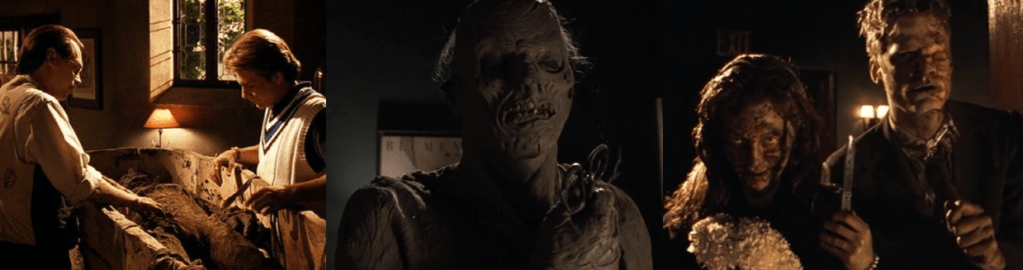 The first full-length story to spring to life is “Father’s Day”, which revolves around the filthy rich Grantham family. Every year, Sylvia (Carrie Nye), gathers the family for a special dinner. This year, her niece, Cass Blaine (Elizabeth Regan), brings her husband, Hank (Ed Harris), to meet her condescending aunt, her self-absorbed cousin, Richard (Warner Shook), and her great aunt, Bedelia (Viveca Lindfors). Between criticising Cass’s healthy appetite, Sylvia nonchalantly tells Hank that Bedelia, the family matriarch, once murdered the disgustingly wealthy and miserly Nathan Grantham (Lormer). Having accumulated vast wealth through unscrupulous and criminal means, the aged patriarch became aggressive, demanding, and paranoid, believing everyone was using him for his fortune and making constant, abusive demands of Bedelia, who was forced to care for him and endure his belittlement. Bedelia finally snapped after her father orchestrated the death of her fiancé, the only man who’d shown her any kindness, to keep her in check. Unable to take her father’s barrage of insults and childish demands for his Father’s Day cake, Bedelia cracked him in the head with an ash tray. Though free of Nathan’s abuse, Bedelia remained scarred and traumatised, placing a flower at his gravesite every Father’s Day. While drunkenly reminiscing about the murder, (which Sylvia helped cover up to profit from her inheritance), Bedelia is horrified when her father’s gaunt, gruesome corpse suddenly bursts from his grave and throttles her to death, still slurring demands for his cake. While having a smoke, Hank wanders into the family cemetery and ends up crushed when the zombified Nathan telekinetically drops a gravestone on him. When Cass expresses concern for her husband, Sylvia begrudgingly volunteers to look for him (hinting at her desire to seduce him), only to end up with her head twisted backwards by Nathan. Impatient and frustrated, Cass demands the lackadaisical and half-cut Richard help search for their missing party, only to be appalled when Nathan’s ghastly, maggot-ridden corpse bursts from the kitchen and proudly presents his cake: Sylvia’s severed head on a silver platter, covered with frosting and candles!