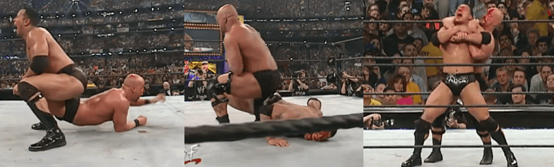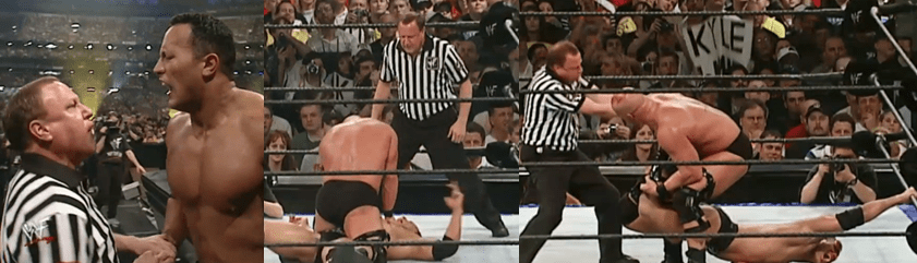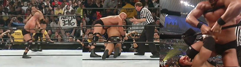 As Heyman was fond of saying during this time, Austin was “like a shark that smells blood” the moment the blood began flowing and began to relentlessly target the Rock’s lacerated forehead with a barrage of fists, shutting down a potential comeback with a Neckbreaker, and stomping away on the Rock in the corner of the ring. It was only when Austin found himself distracted by Hebner’s interference that the Rock was able to finally make a proper comeback by launching Austin into the exposed turnbuckle and gaining a little retribution by bashing Austin in the head with the ring bell, busting him open before Austin was able to regain control of the match with a wicked catapult into the ring post. Rock sold the hell out of that move, snapping his head back at the very last second to really sell the idea that he had collided with the post in a sickening way, which more than made up for the announce table simply collapsing under his weight and, potentially, ruining a planned table spot. Austin continued his assault by bashing Rock in the head with a monitor but Rock managed to finally turn the tide by locking Austin into the Sharpshooter; the crowd was thrust into a tumultuous sea of conflict as Austin screamed in agony, refused to quit, and desperately reached for the ropes but Rock shifted him back to the middle of the ring! Austin, though, was able to reach the ropes and then put the Rock into a Sharpshooter, with the crowd being far less divided about this and even less impressed when the Rock powered out of the move. Annoyed, and growing increasingly frustrated, Austin followed up with the Million Dollar Dream!