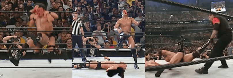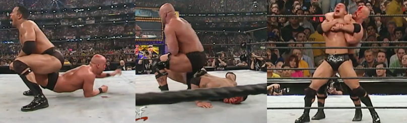 An awkward miscommunication off an Irish whip eventually saw Austin switch with Angle. However, when Angle went for a German Suplex, Jericho rolled through and briefly applied the Ankle Lock to a massive ovation; although Angle escaped, he was visibly limping when he tagged out. Austin and Angle continuously tagged in and out but Jericho eventually made the hot tag and the match picked up again as the Rock tied Angle in the Sharpshooter; this surprisingly caused an immediate tap out and an aghast Paul Heyman to almost have a coronary! Austin, the last man standing for his team, Austin countered a diving crossbody and traded Walls of Jericho attempts with Y2J. Although he got his knees up to counter a Lionsault, Austin’s top-rope double axehandle didn’t hit and he barely kicked out after Jericho landed a missile dropkick. However, another awkward exchange saw Austin take Jericho out; although Austin and the Rock immediately rekindled their rivalry, Jericho spitefully planted the Rock with the Breakdown, completing his heel turn and earning him the admonishment of the Undertaker. Thankfully, the Rock was still able to kick out; when the Rock tried a comeback, he was launched outside and smashed off the ring post and the steel steps. Back in the ring, Austin’s spinebuster led to the Rock being trapped in a Sharpshooter that had Paul Heyman screaming for a repeat of the Montreal Screwjob; when the Rock reached the ropes, Austin tried to nail him with the WWF Championship and ended up in the Sharpshooter as well! The Rock countered a Stunner with one of his own, but couldn’t capitalise thanks to a low blow and interference from Alliance referee Nick Patrick. Austin took advantage to nail a Rock Bottom and was so incensed when the Rock kicked out that he took it out on Nick Patrick and forced Earl Hebner back into the ring. After the Rock ate a Stone Cold Stunner, the match seemed to be over; however, Kurt Angle suddenly nailed Austin with the WWF Championship! The Rock then hit the Rock Bottom and finally pinned Austin to eliminate him, win the match, and put the Alliance out of business. As the Alliance reacted in anguish and shock, Vince sauntered out to bask in his victory to really hammer home his superiority.