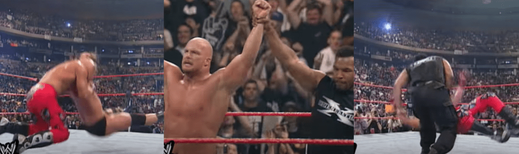 The match’s pace finally picks up a bit as Austin hammers on HBK, does his Mudhole Stomp in the corner, and fires back with a flurry of offense. Shawn desperately knocks Austin down with his flying forearm/kip up spot and then clambers up to the top rope for his big elbow drop. After landing the move, Shawn begins tuning up the band for the knockout shot but, when he flies in with Sweet Chin Music, Austin ducks it, and goes for the Stunner! Shawn counters out of it, goes for the Superkick again but Austin catches his foot, spins him around, and hits the Stunner! Tyson then slides into the ring and counts a quick three count to give Austin the WWF Championship in a very sudden end to a fairly lacklustre match. Afterwards, Tyson reveals that he was an Austin 3:16 fan all along, a point he emphasises by laying HBK out with a big right hand and then leaving the ring with the new champion.