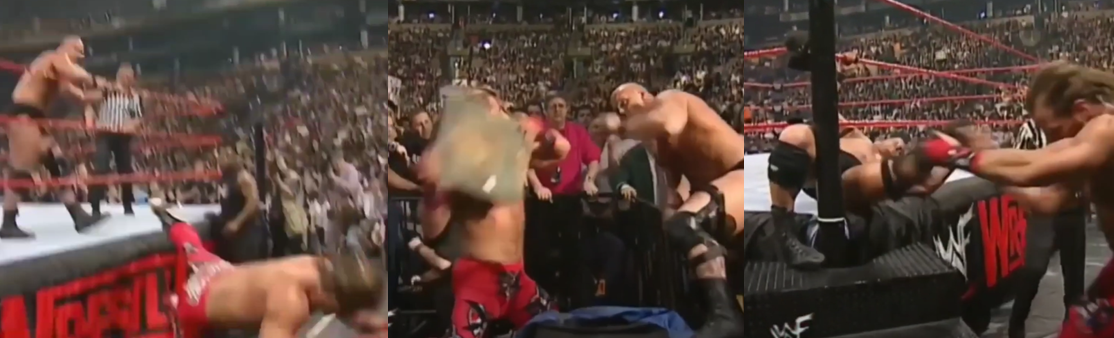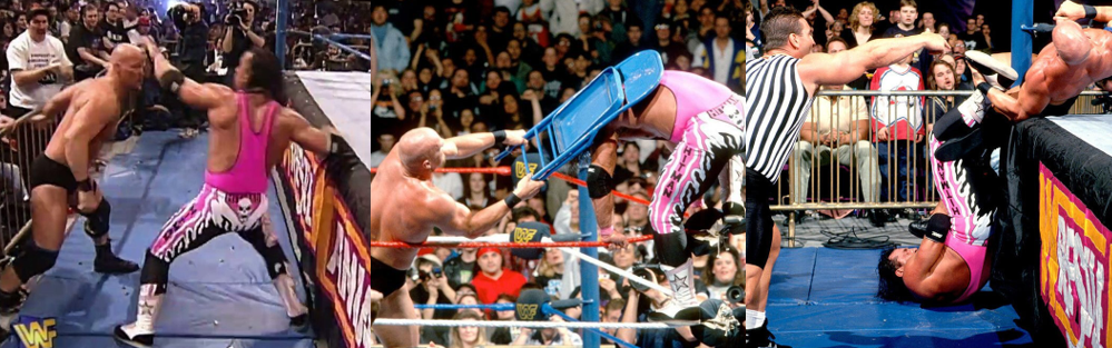 Austin, however, puts a stop to that by throwing some punches in the corner, yanking down Shawn’s tights to expose his ass (much to the delight of the crowd), and finally tossing him out of the ring and into his D-X buddies. When Austin follows to press his attack, he is assaulted by Triple H and tossed into the metal barricade. For his efforts, referee Mike Chioda has Shawn’s running buddies ejected from ringside. All of this was still enough for HBK to gain the advantage and a ringside brawl ensues that sees Shawn slam Austin with the band’s equipment and toss him into a dumpster but, the moment they get back into the ring, Austin regains control by countering HBK’s driving axe-handle and whipping the WWF Champion into a corner for Shawn’s signature flip spot. Austin starts to work on Shawn’s arm with a series of stomps; he shuts down Shawn’s speedy offense by dumping him into the ropes but, though he takes a dive to the outside and onto the table, HBK is still wily enough to avoid being hit with the Stone Cold Stunner. Austin presses his advantage, putting a beating on Shawn and going for a series of pins before wearing Shawn down with a headlock. Seems a bit early into the match for a rest hold but, considering Shawn’s injury and the bumps he’s already taken, it’s perhaps not surprising. HBK counters out of the hold and is finally able to gain some momentum by enduring a beating and walloping Austin in the face with the ring bell, which the referee conveniently misses.