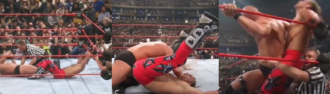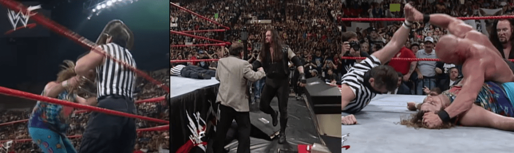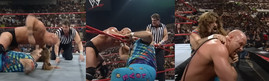 Back in the ring, HBK starts working over Austin’s head despite clearing struggling with the pain of his back injury; more uninspired and slow-paced holds and moves follow before Austin springs back to life, tackles HBK, and tosses him outside again! HBK recovers and starts smacking Austin’s left leg and knee off the ring post and the steel steps, as though the match needs to slow down any more, and continues the assault when he gets back in the ring to put Austin’s leg through the wringer for a bit. Austin surprises HBK with a kick up the ass and a roll-up but this isn’t modern-day WWE so Shawn easily kicks out and continues to wear down Austin’s leg using stomps and the ring ropes. When Austin rolls to the outside for a reprieve, Shawn hits him with a baseball slide and Tyson hefts Austin back into the ring so that HBK can lock in the Figure Four Leglock. Despite HBK grabbing the ropes for additional leverage, Austin refuses to tap out and successfully reverses the hold and buy himself some breathing time. Austin almost catches HBK with a pin off a catapult into the corner and then Shawn transitions into a sleeper hold; in his desperation to get out of the hold, Mike Chioda gets squashed in the corner and taken out of the match.
